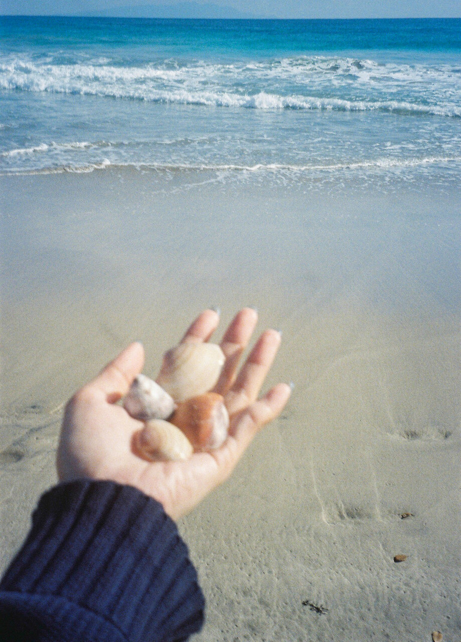 実は私、砂浜に来るとついつい貝殻やシーグラスを探しちゃうんです。手のひらにちょこんと乗せて撮影した写真は、この旅の始まりを感じるお気に入りの一枚になりました。