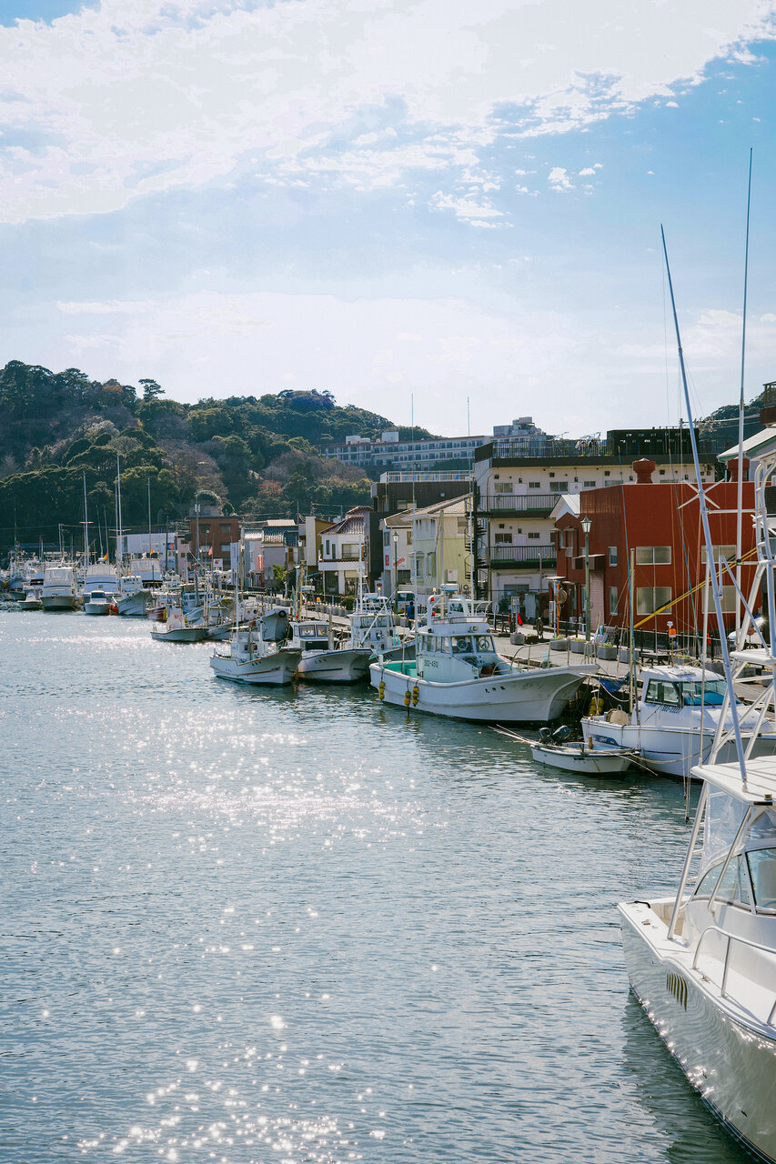 下田港は、山に囲まれた入り江型の港で、とても波が穏やかでした。この日は天気もよかったので、青い海と空、船のコントラストが利いた写真を撮影することができました。