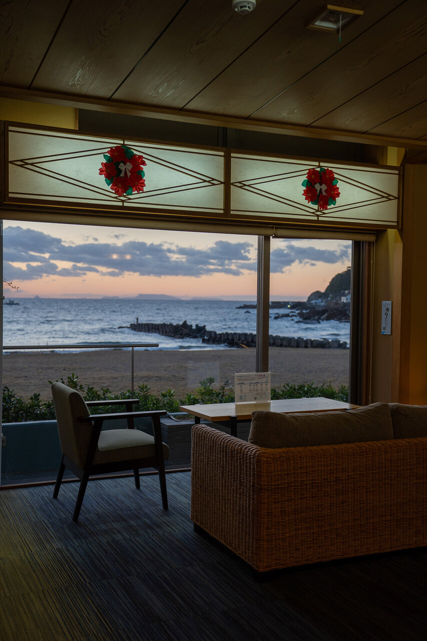 今夜の宿は、リニューアルされたばかりの「河津温泉郷 海遊亭」です。到着してまず驚いたのは、ロビーに入った瞬間に目に飛び込んでくる大きな窓と、その向こうに広がる青い海。ウェルカムドリンクのコーヒーをいただきながら、ホッと一息つく時間は格別でした。セルフでかき氷も作れるようになっていて、お子様連れのご家族も楽しめそうな、心温まるおもてなしが印象的です。全12室という隠れ家のような宿で、館内はとても落ち着いた雰囲気。