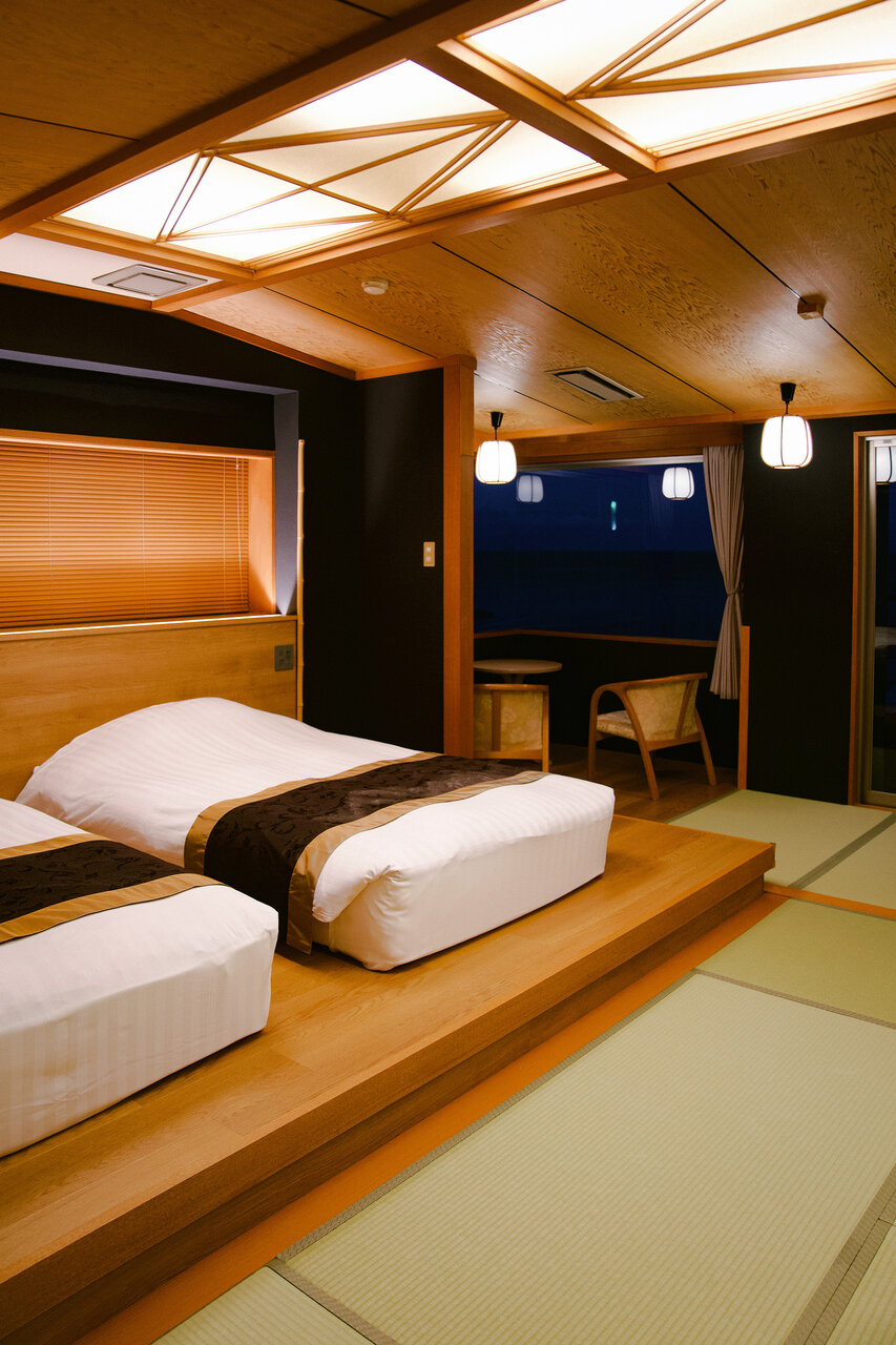 すべてのお部屋が海に面したオーシャンフロントの客室です。一部の客室には露天風呂が付いており、潮騒の音を聞きながら入浴できます。小上がりにベッドが配置された和モダンなお部屋は、広々としていて疲れを癒やすのに最高です。