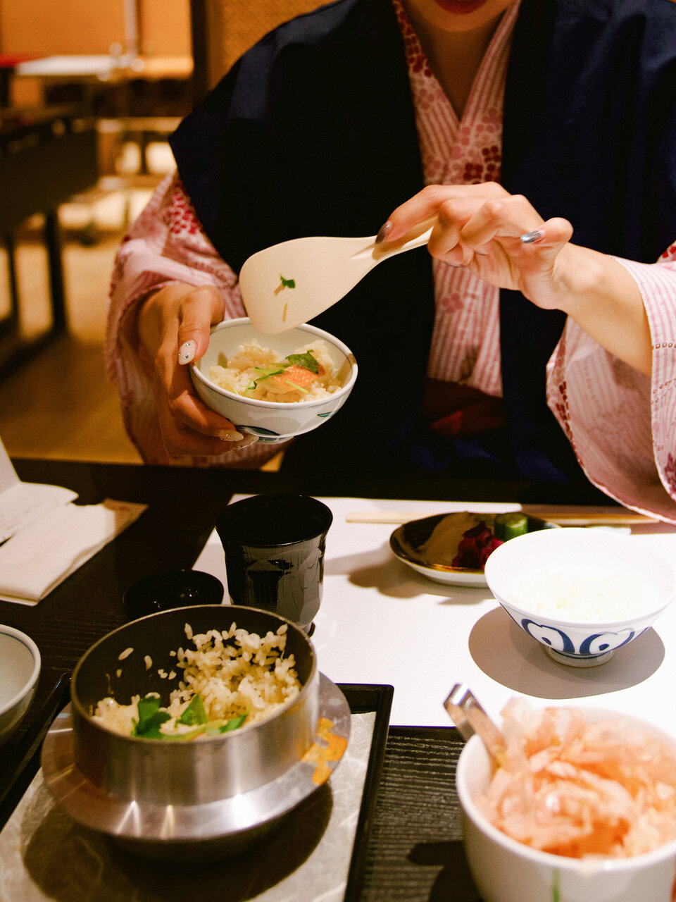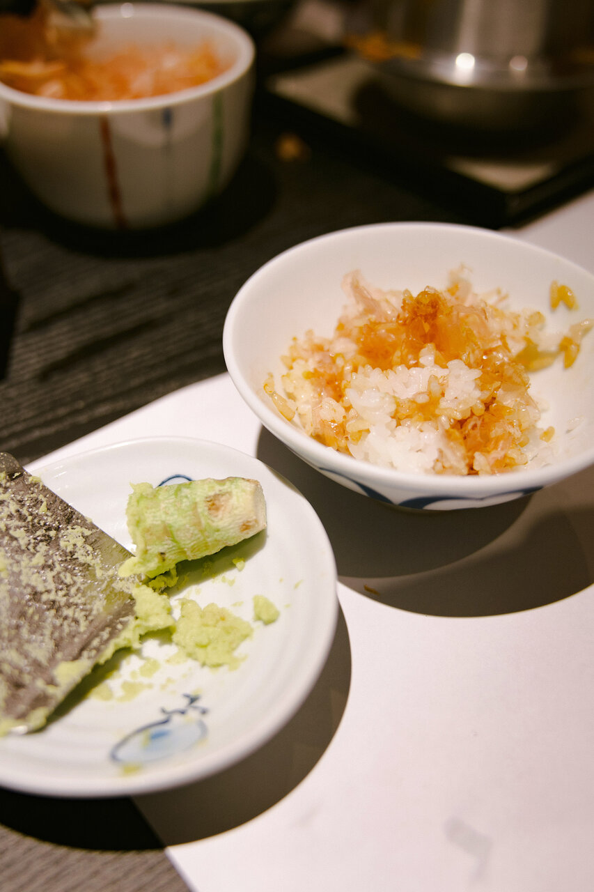 伊豆名物の「山葵丼(わさびどん)」にも挑戦! 自分で山葵をすりおろすのは初めてでしたが、すりたての爽やかな香りが鼻を抜け、おかかとの相性も抜群です。季節を感じるお料理の数々に、心もお腹も満たされる贅沢なひとときでした。