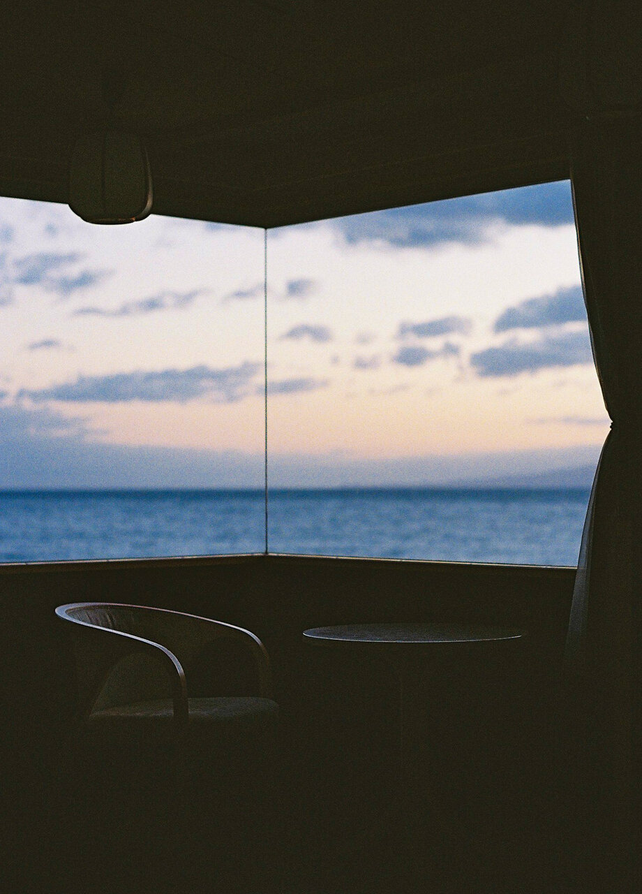 翌朝は、誰よりも早く起きて、夜明け前の景色を楽しむことからスタート。窓の外がまだ深い青に包まれている、朝日が昇る前の部屋の静寂なトーンがたまりません。