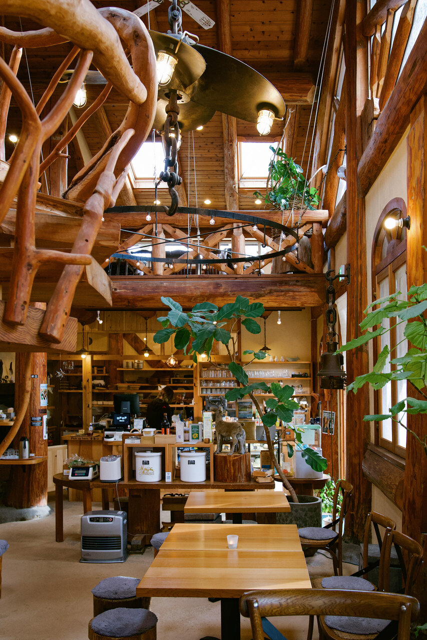 ここは地元の建築会社「天城カントリー工房」が手がけたカフェで、足を踏み入れた瞬間に木の温もりに包まれます。1998年に建てられたという本格的なログハウスは、なんと私と同い年! その事実に一気に親近感が湧き、建物を見る目がより愛おしくなりました。