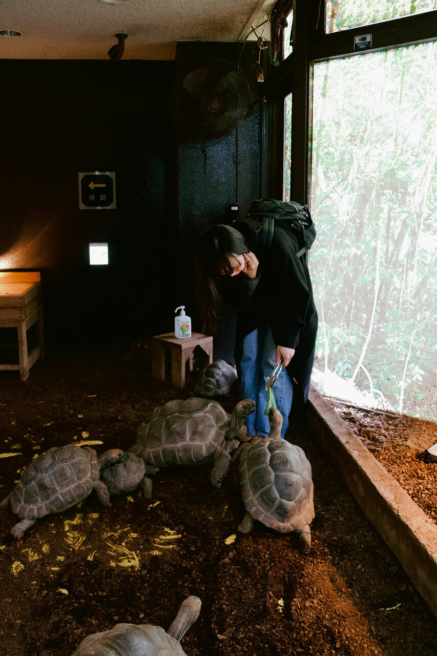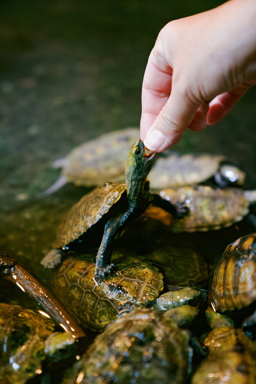 カメの餌やり体験では、カメたちが一斉に集まってくる様子に癒やされました。カメって思っているより動きが早い!