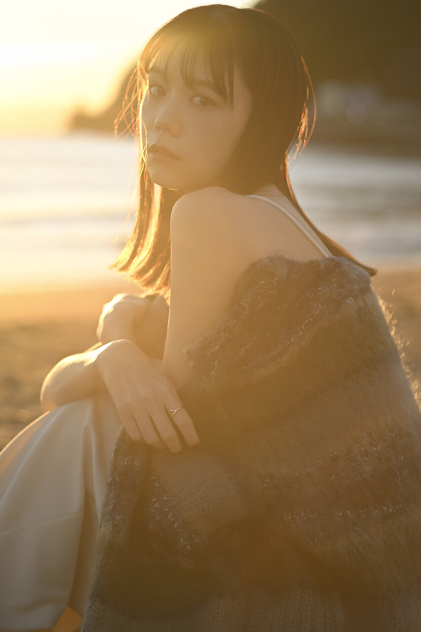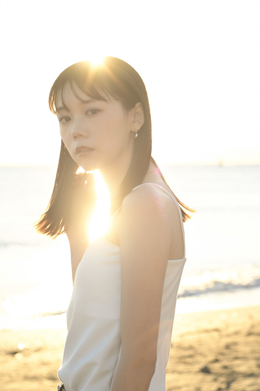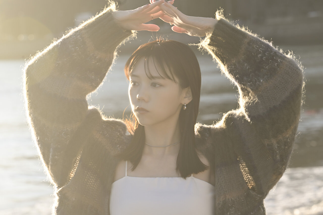 逆光に包まれた彼女は、こちらを強く見つめているわけでも、完全に視線を外しているわけでもない。