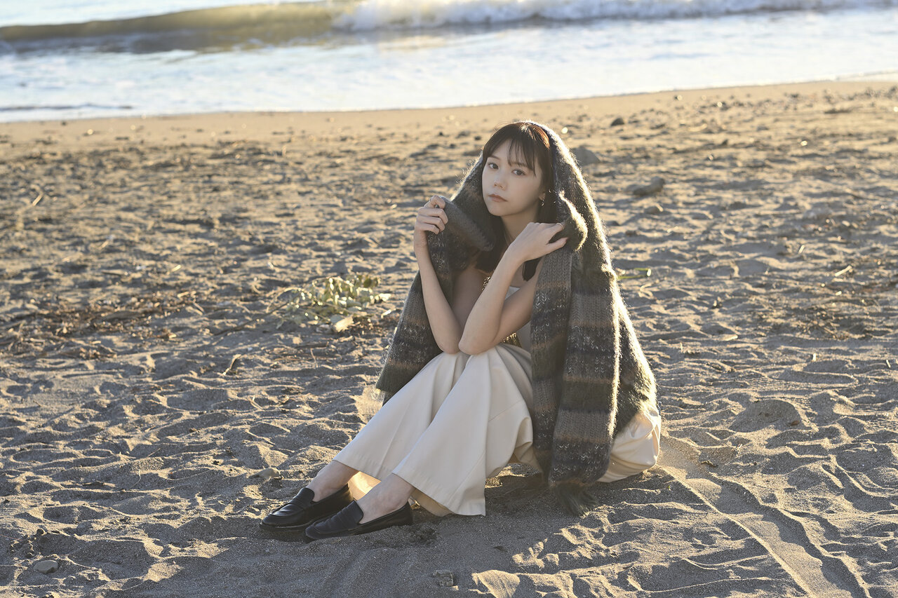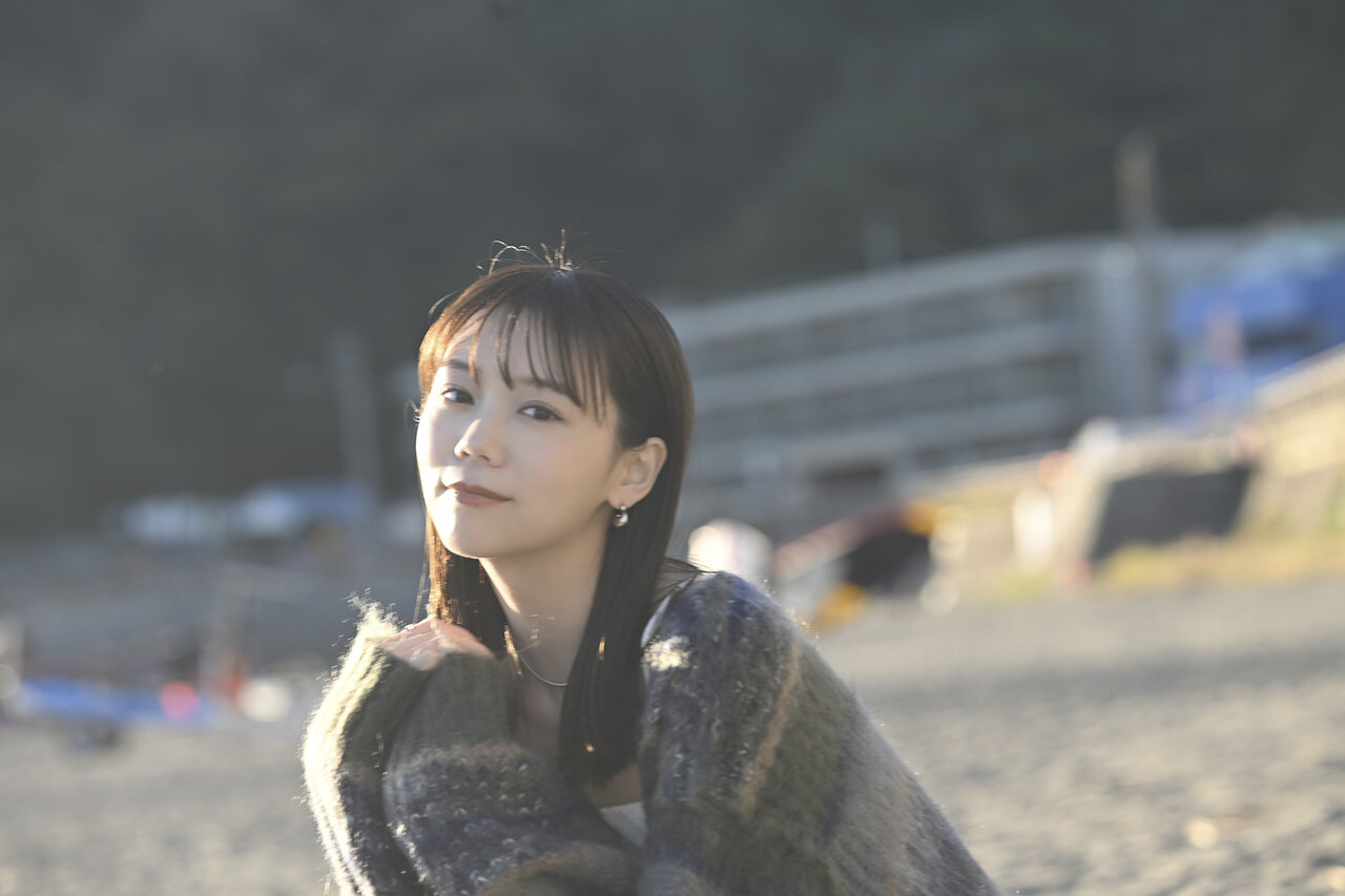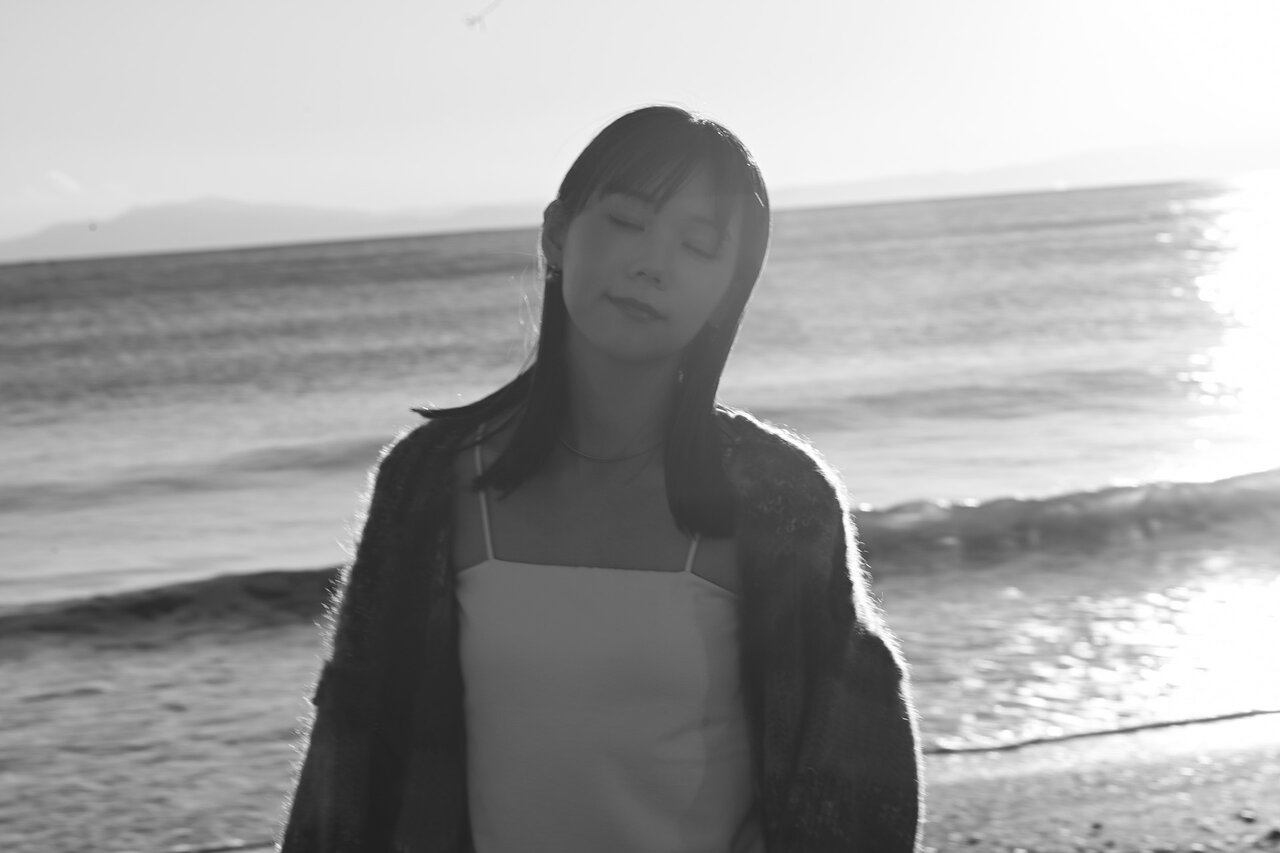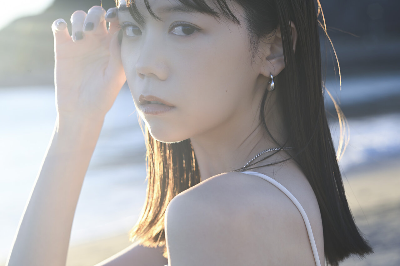 逆光に包まれた彼女は、こちらを強く見つめているわけでも、完全に視線を外しているわけでもない。