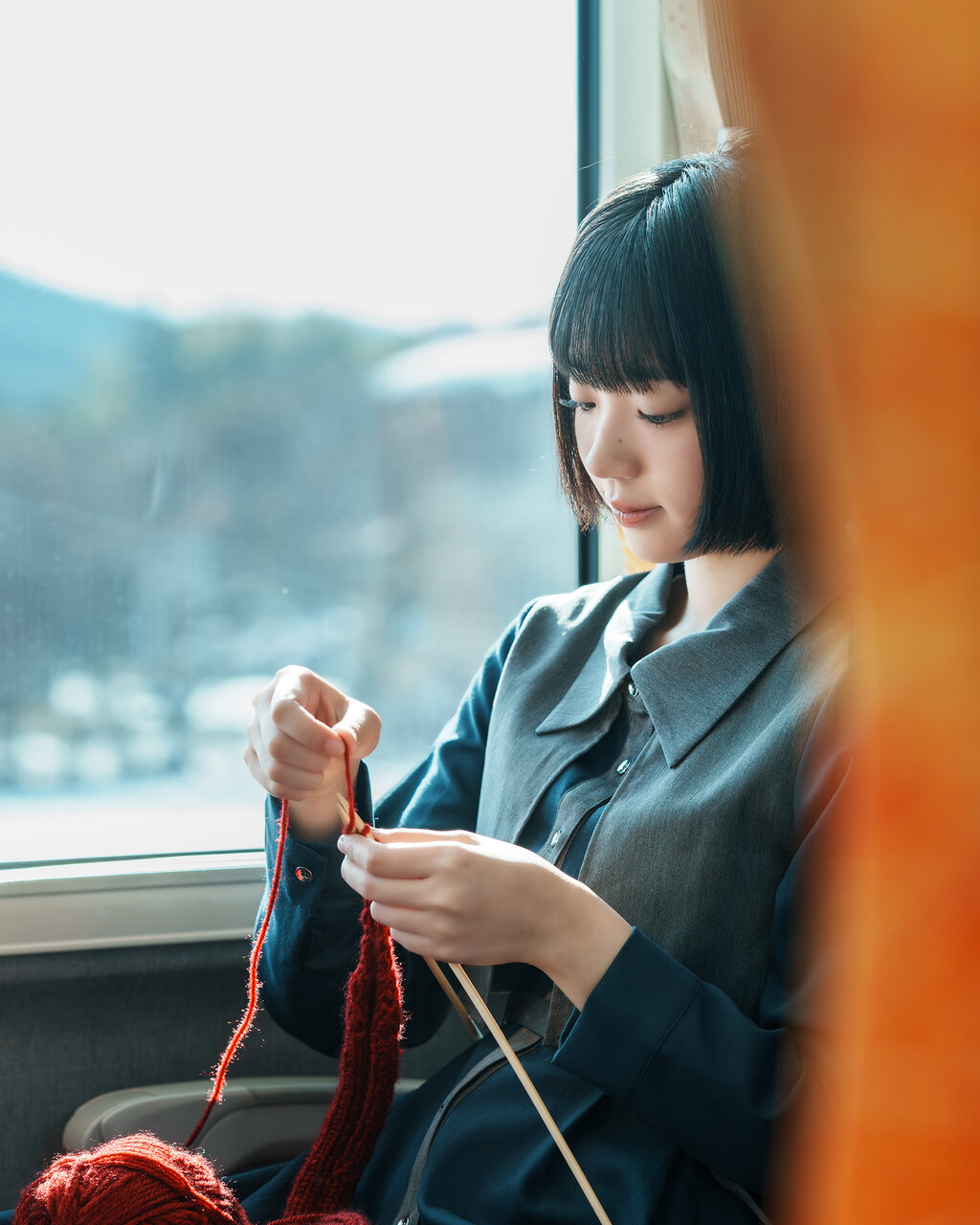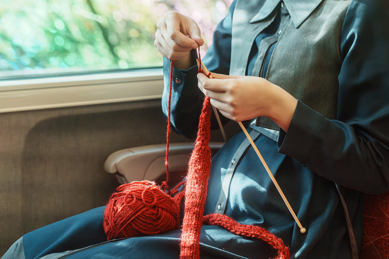 最近凝ってる編み物を無心で進める、最高にゆたかな列車時間。