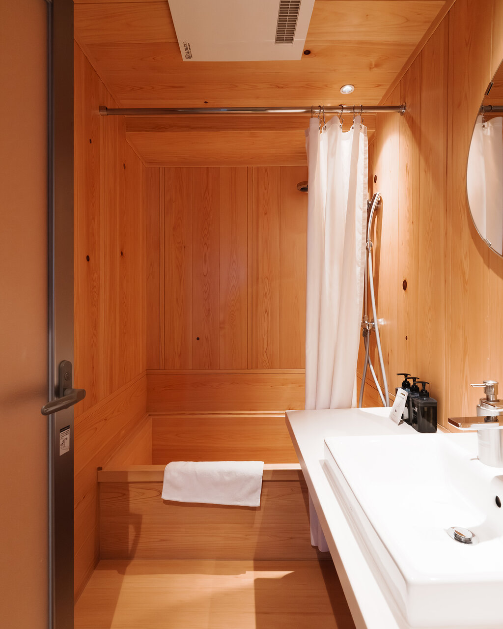 なんと全室ヒノキ風呂付き。近づくだけで香りに癒されちゃう。夜が楽しみ。