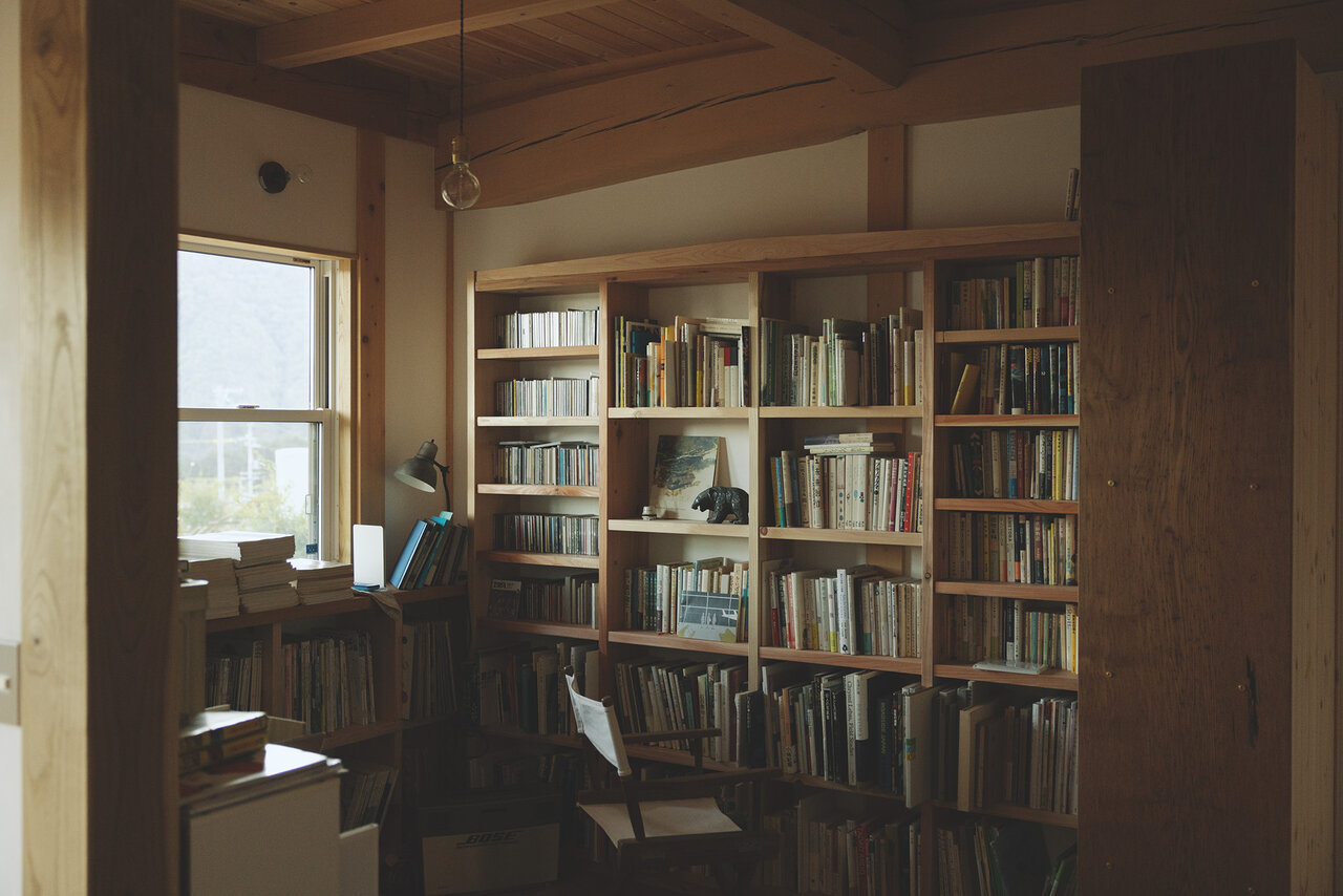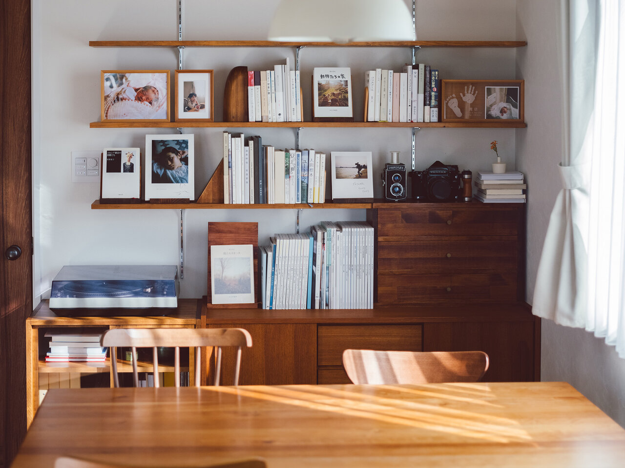 リビングにある本棚で、写真集や画集が多いです。読書空間をあえて壁と本で囲み少し閉鎖的にすることで落ち着いて本と向き合えるようにしています。同じ理由で、照明も電球にしています。雑誌や絵本なども大好きで、手放せずに増えていく一方なので、収納を工夫しながら増やしていくのも楽しみになっています。