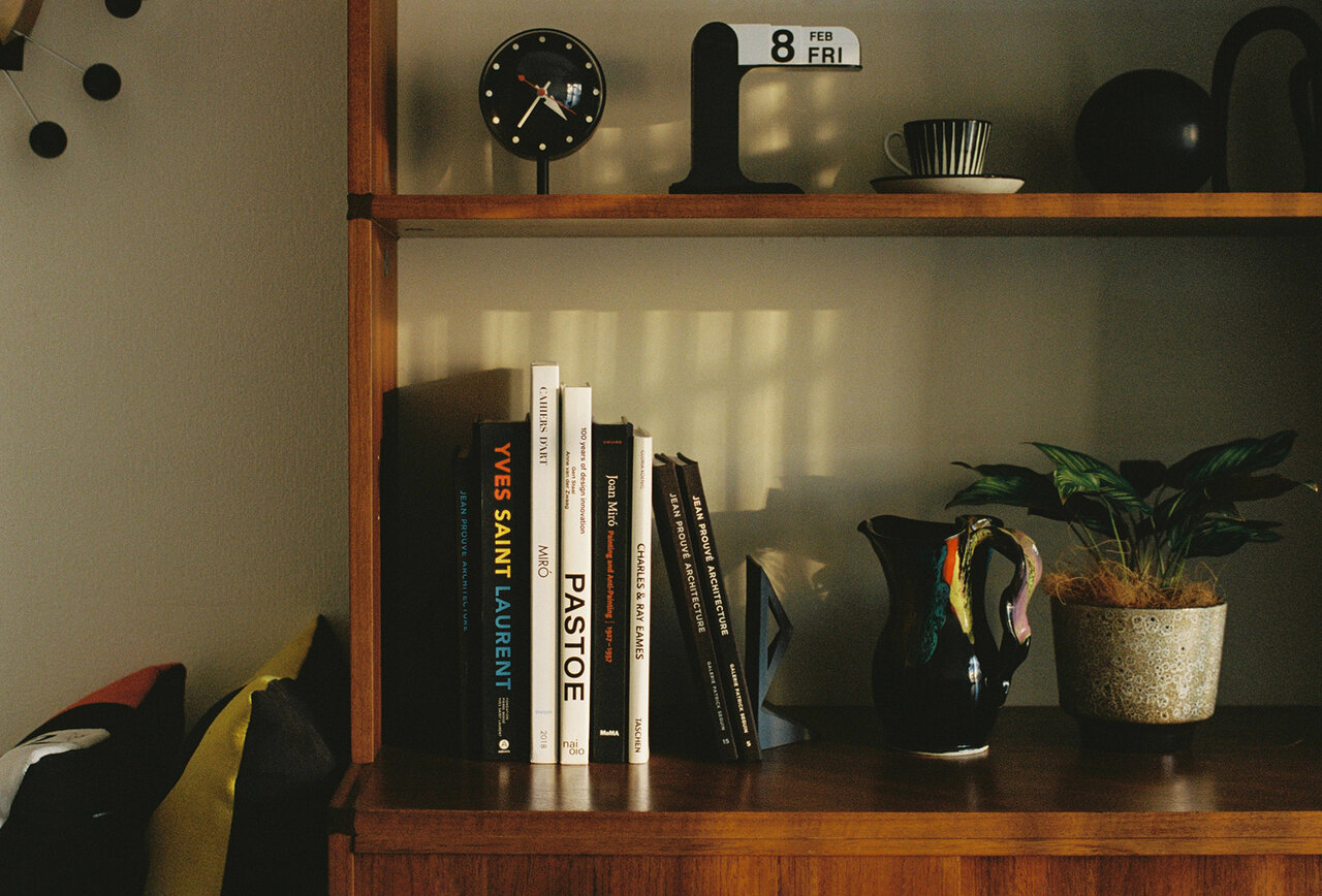 好きな本のなかから何冊かを、リビングにあるキャビネットにディスプレイしています。配色や背表紙のフォントなどが、棚にマッチしているものを選んでいて、インテリアの本が多いです。ここにある以外にも、昔から所有している古い画集やヴィンテージのレシピ本など、写真を撮る上で影響を受けている本たちを大切に保管しています。