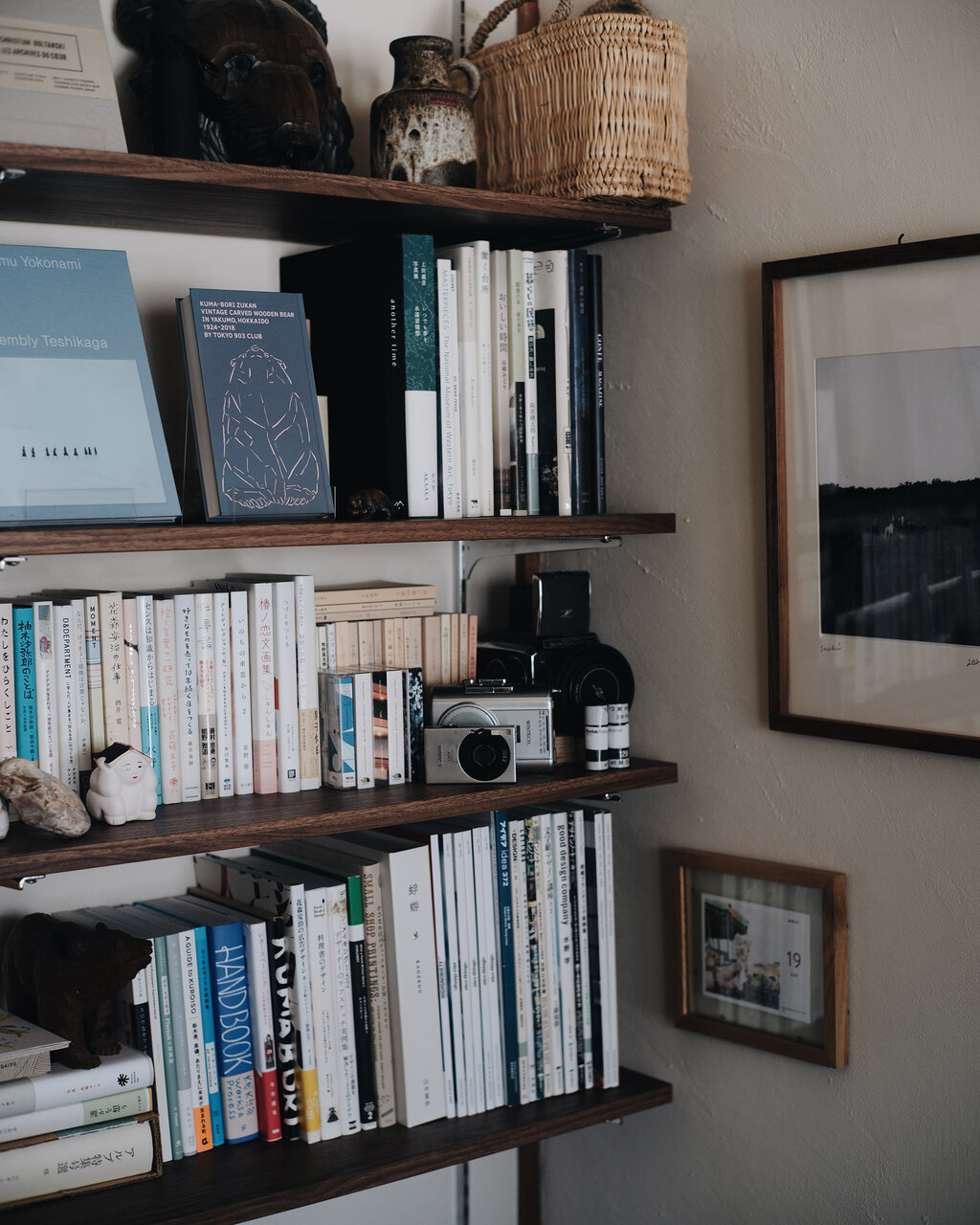 仕事部屋の本棚は自分でDIYしたものです。仕事に関連するデザイン本や写真集や画集、デザインに携わった本などを置いています。眺めるだけでも楽しい本棚を目指して、とにかく自分の好きなものを自由に並べるようにしています。自分がどんなデザインが好きなのか、どういう方向性を目指したいかなど、この本棚を見たらわかるような。リアル版のPinterestみたいな感じです。ゆくゆくは棚をもっと増やして本に囲まれた仕事部屋にしていきたいです。