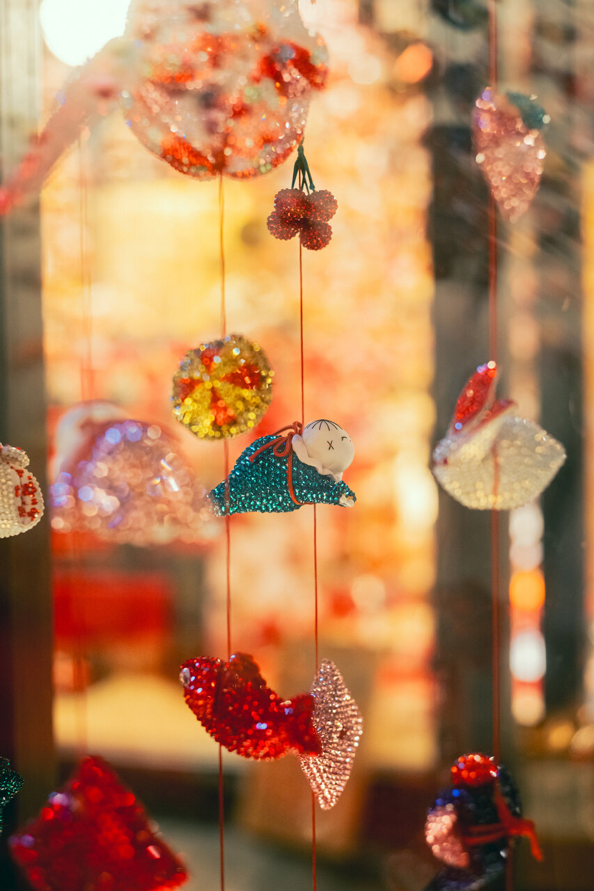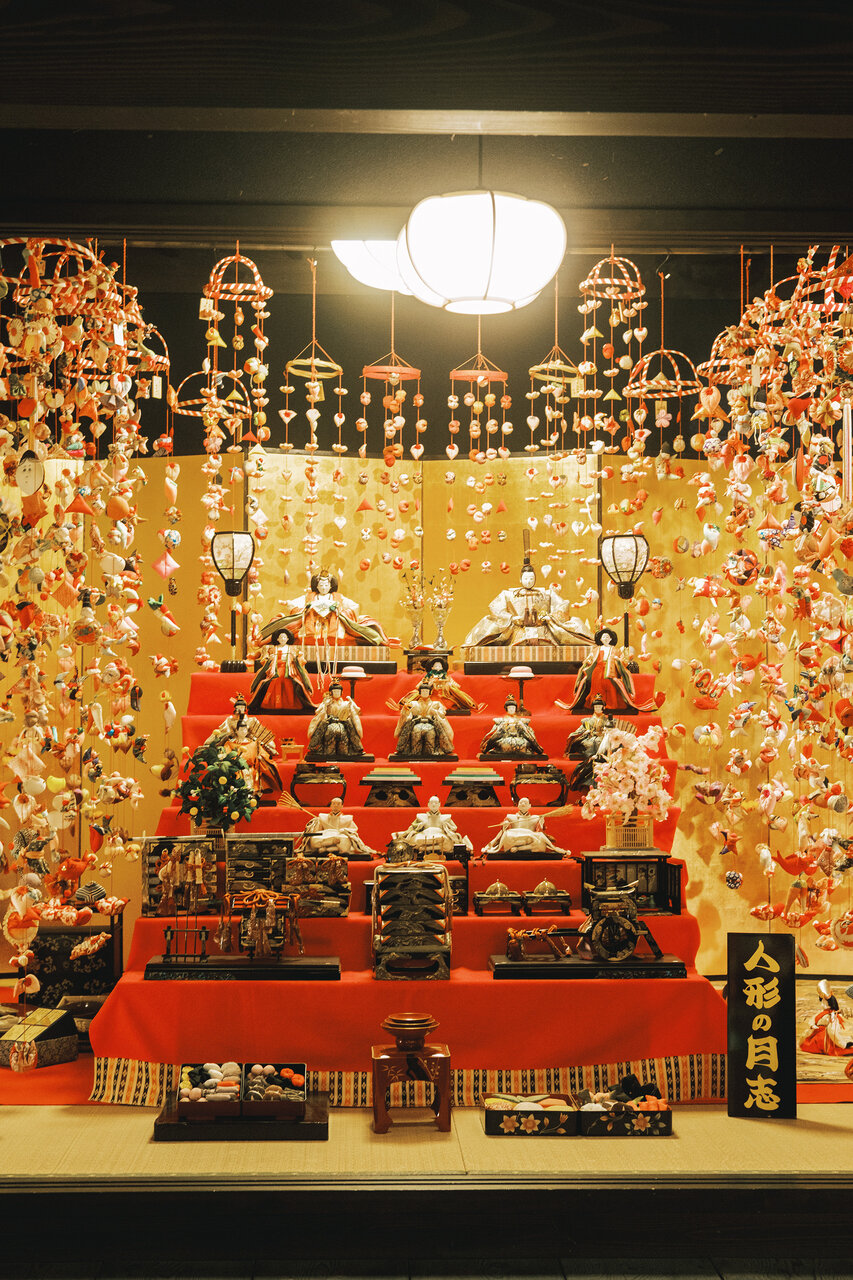 野菜に見立てた雛やデコレーションされた雛、いろいろな色の雛、人形と一緒に飾られたものなど、さまざまな種類があり、見ているのも写真を撮るのもとても楽しかったです。展示数が多く、天井から吊るされている位置も高さが異なるため、背景や手前をぼかして立体感が出るように撮ると雰囲気が増します。また、館内のやわらかい灯りを活かして光の方向や影を意識すると、つるし飾りの色や素材感が際立つ1枚が撮影できるので試してみてください。