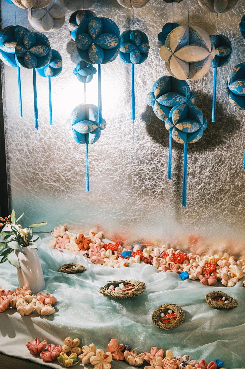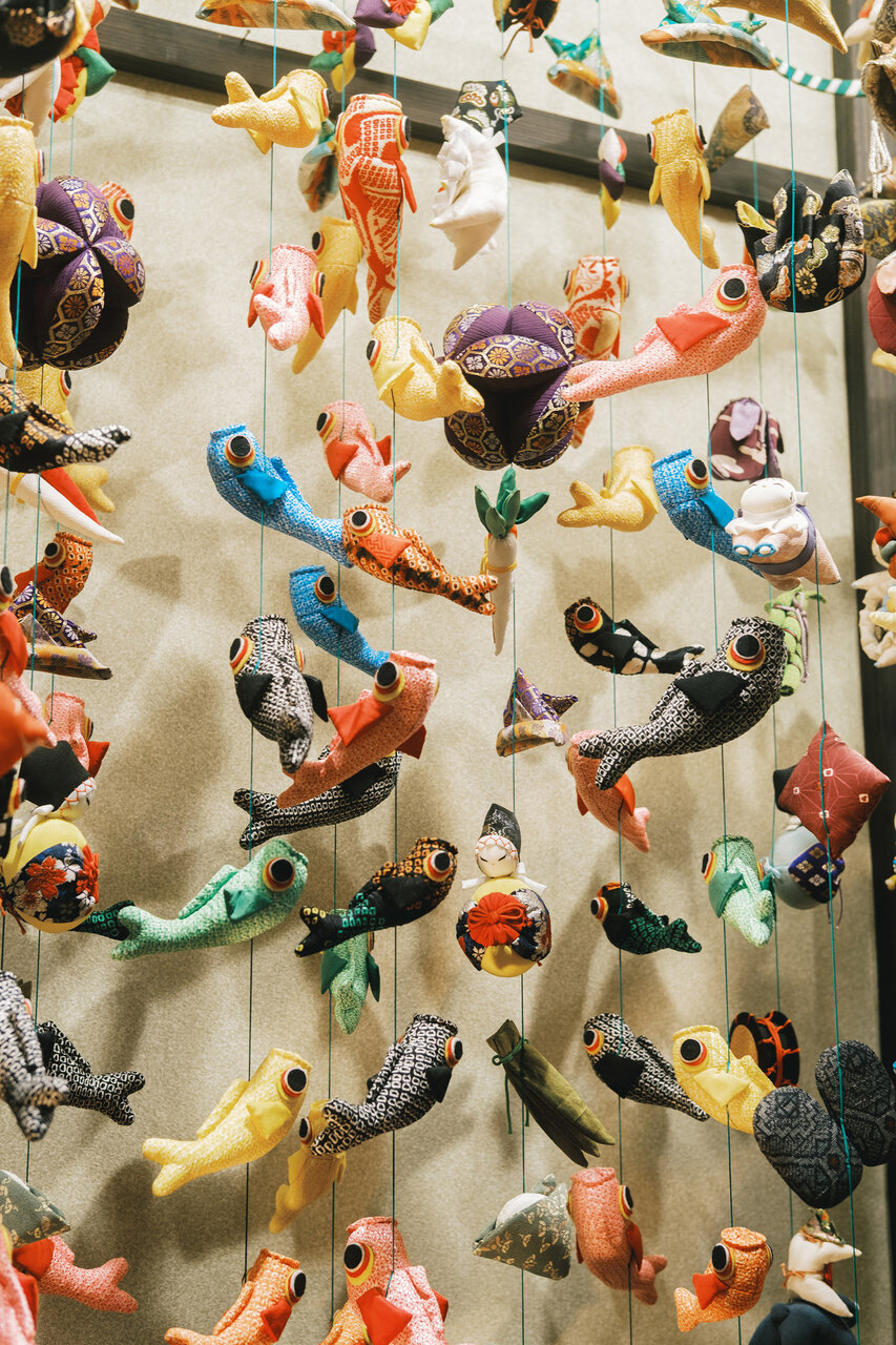天井から吊るされた雛のつるし飾りの間を歩くと、鮮やかな色彩と細やかな手仕事が光を受けて輝き、まるで空間全体が舞台装置のように感じられました。