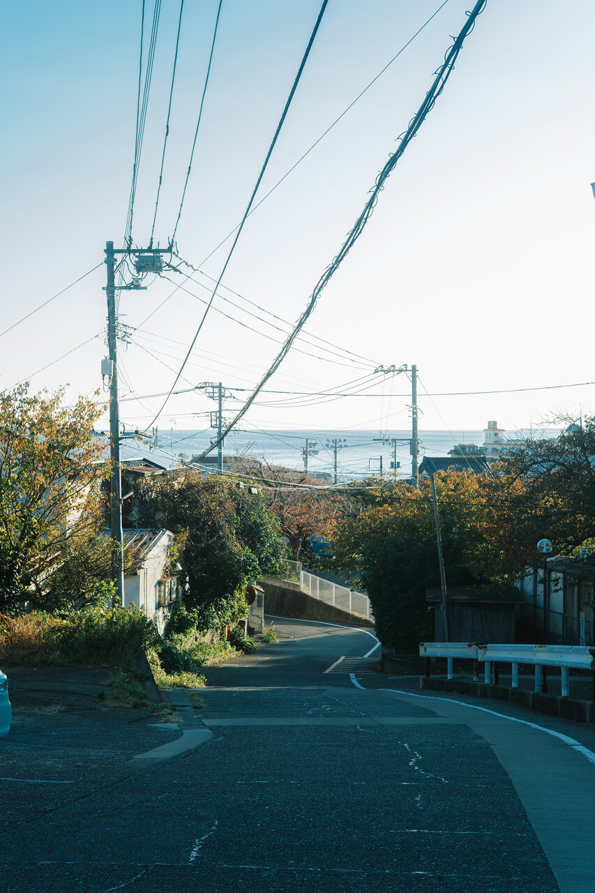 文化公園雛の館から稲取駅へ徒歩で戻る途中、「稲取温泉街」へ立ち寄り。海沿いに広がる落ち着いた温泉街で、昔ながらの旅館や商店が並ぶ町です。海の青や情緒ある路地、坂道から見える海と空の風景が印象的で、スナップを楽しむのにぴったりの場所。路地や坂道を入れたり、空を広めに入れたり、構図もさまざま楽しめます。