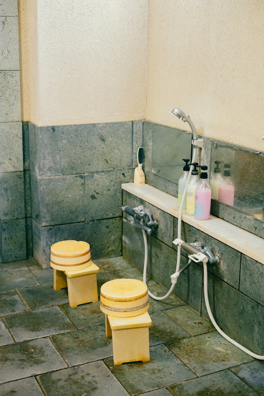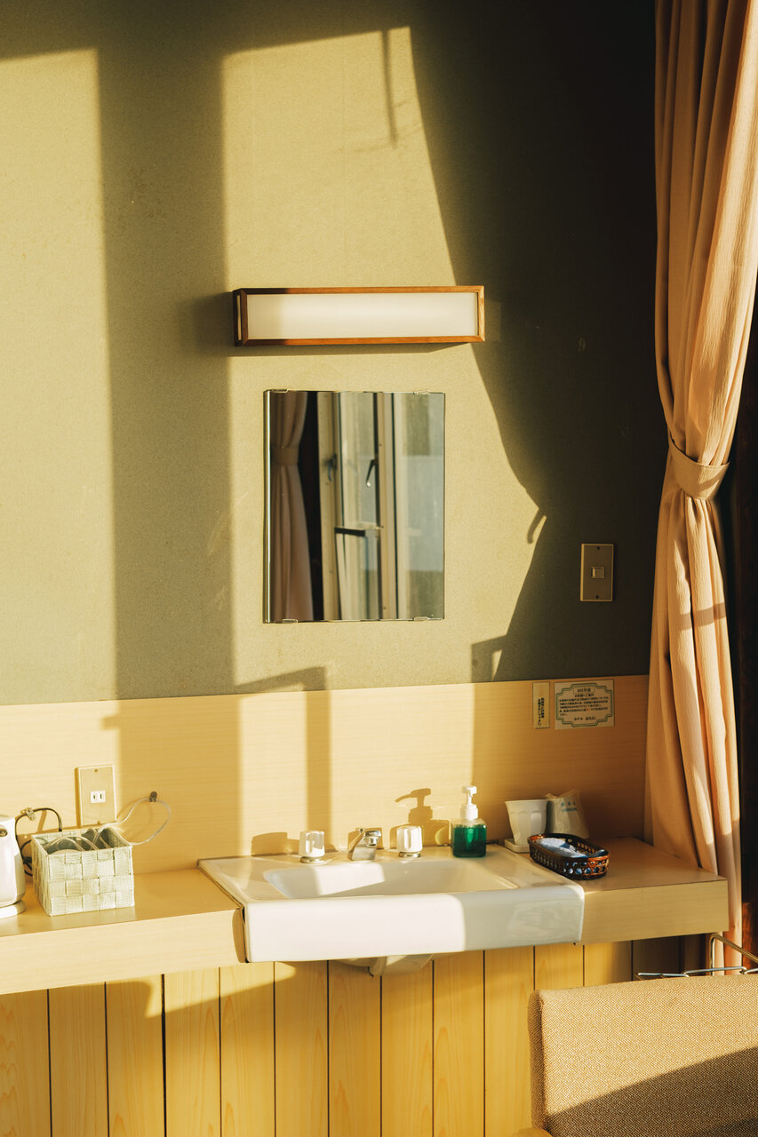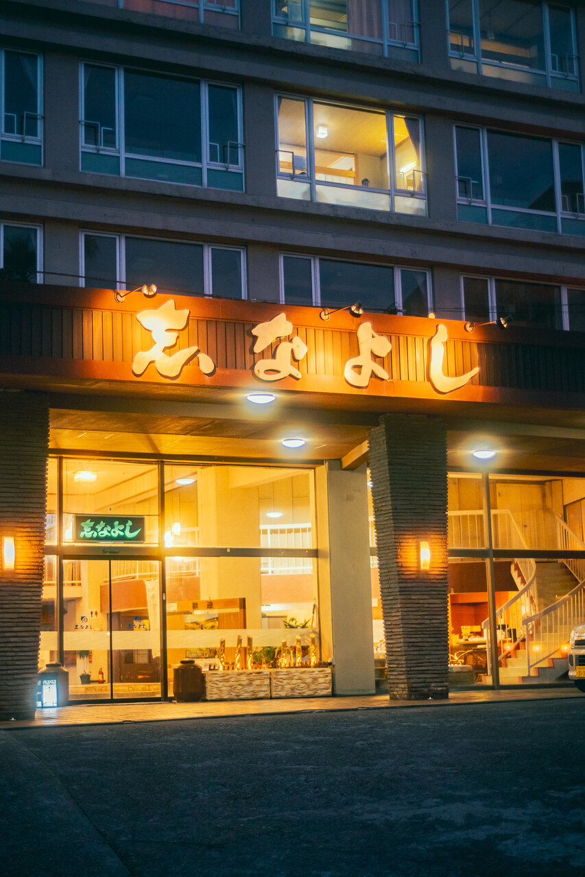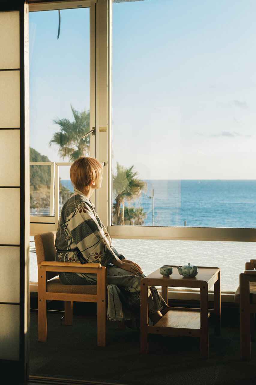 「熱川温泉」バス停に着く頃には、あたりは薄暗くなり、街に灯りがともりはじめていました。そのまま、ゆっくり歩いて本日のお宿へ。海沿いに建つ温泉宿で、どこか懐かしい昭和レトロ感と、落ち着いた静けさが魅力。スタッフのみなさんの丁寧であたたかい接客も心地よく、一人でも気兼ねなく過ごせる雰囲気があります。