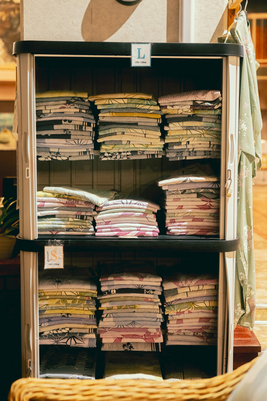 ロビーには落ち着いたソファスペースもあり、部屋以外でもゆっくりと過ごせそうです。チェックインを済ませたら、まずは色とりどりの浴衣から好みのものをチョイス。旅気分が高まります。部屋に荷物を置いてひと息ついたあとは、館内散策へ。