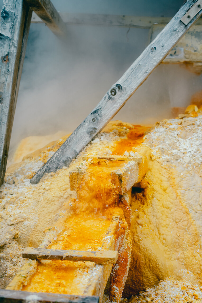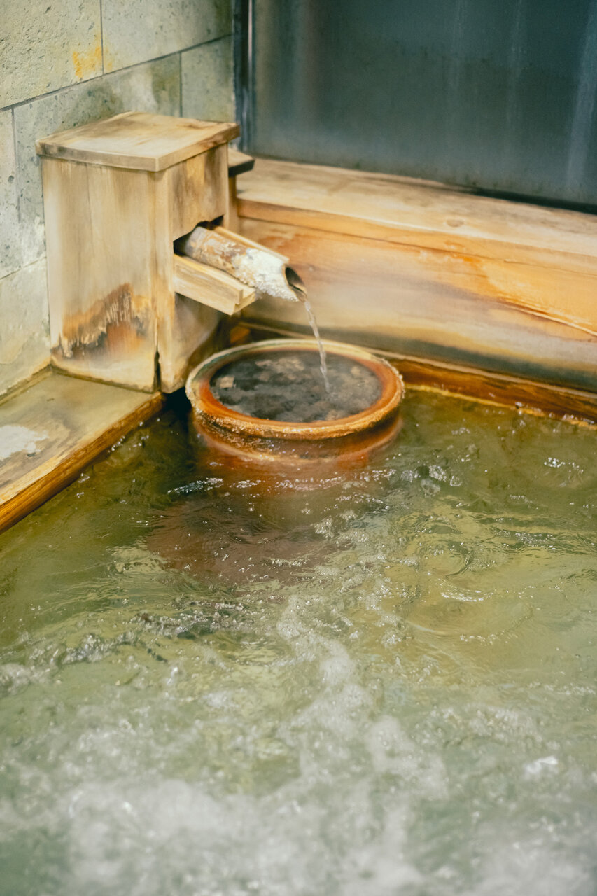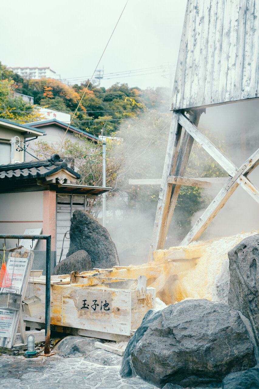 源泉やぐらを見上げるように撮ると、湯けむりが空に向かう流れが生まれ、温泉地らしいドラマチックさを表現できます。