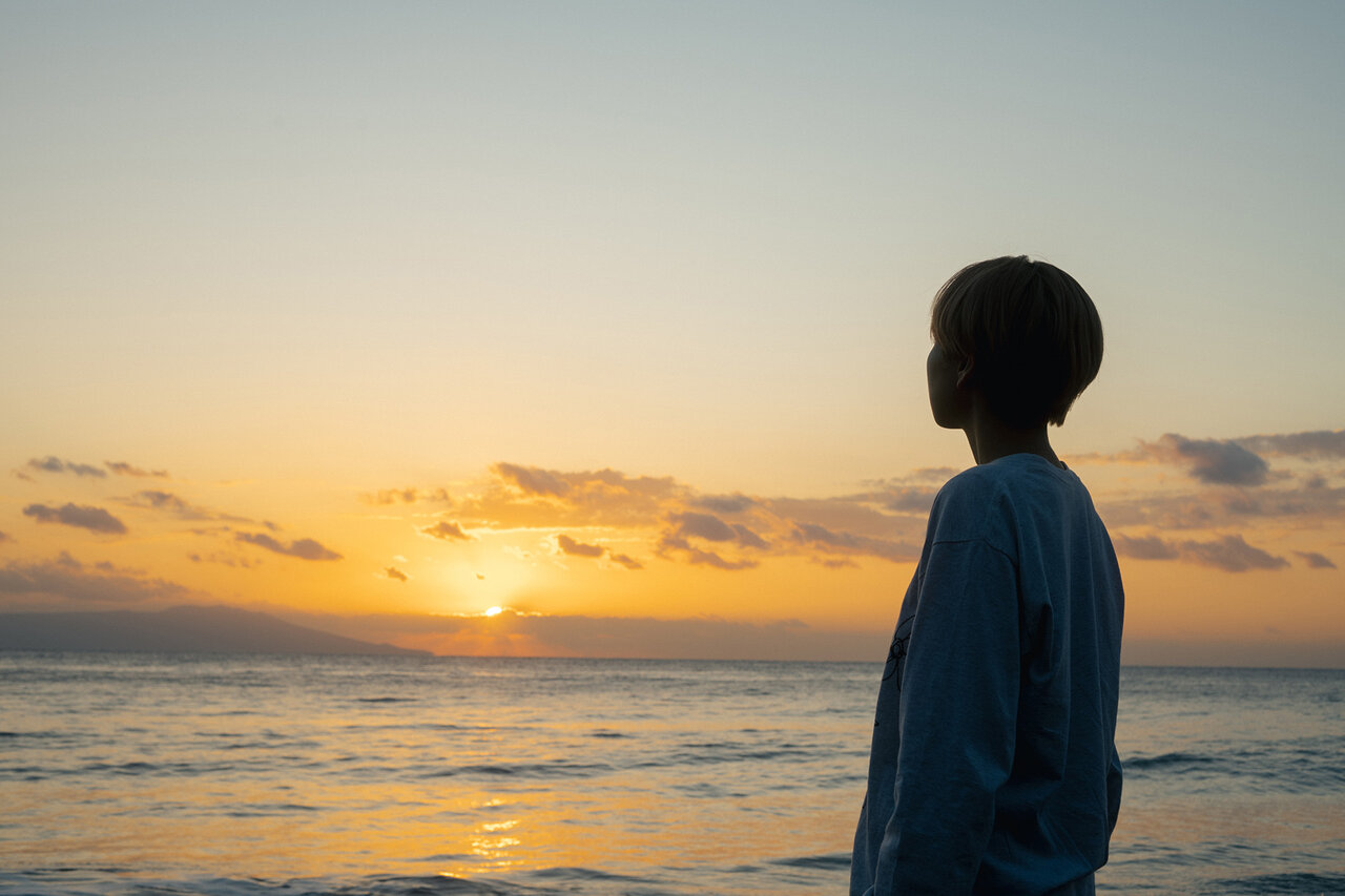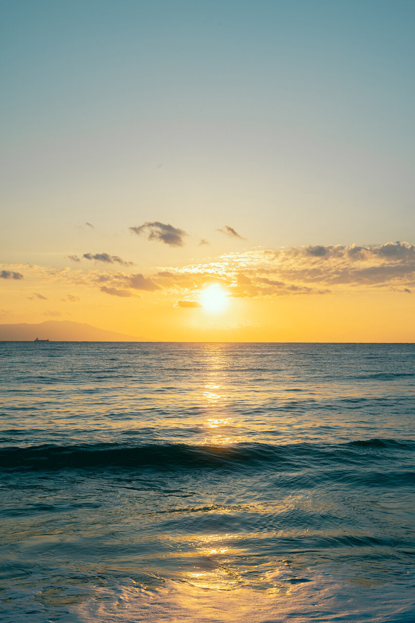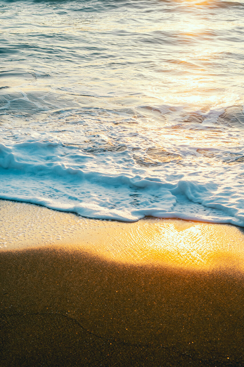 海の青と空の色が鮮やかで、歩くと波音や潮の香りが心地よく、リラックスできる場所でした。砂浜に寄せる波がサイダーの泡みたいにシュワシュワと広がり、その上に朝日が差し込んで、金色にキラキラと輝きはじめる。その瞬間の光景が、とても美しかったです。