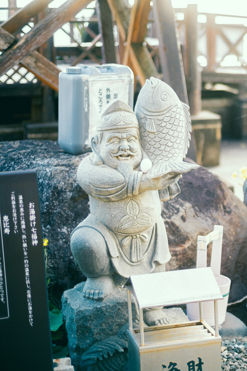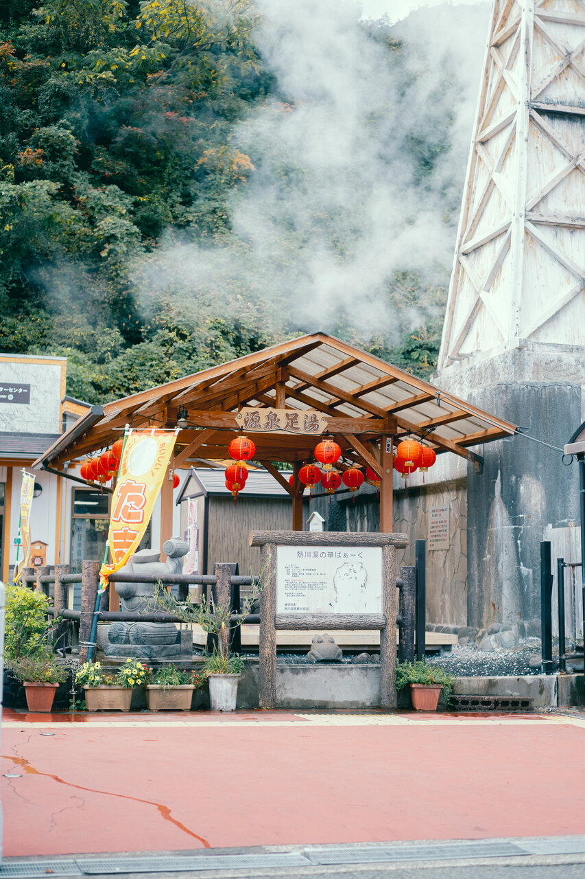 弁財天の周囲には源泉の湯が勢いよく吹き上がるやぐらがあり、透明な湯気がゆっくり立ち昇っていました。曇り空の柔らかい光に包まれ、湯気が白く淡くぼやけ、温泉地ならではの静かで落ち着いた風景を感じさせてくれました。温泉街らしい景観と神秘性が同居するユニークなスポットでした。
