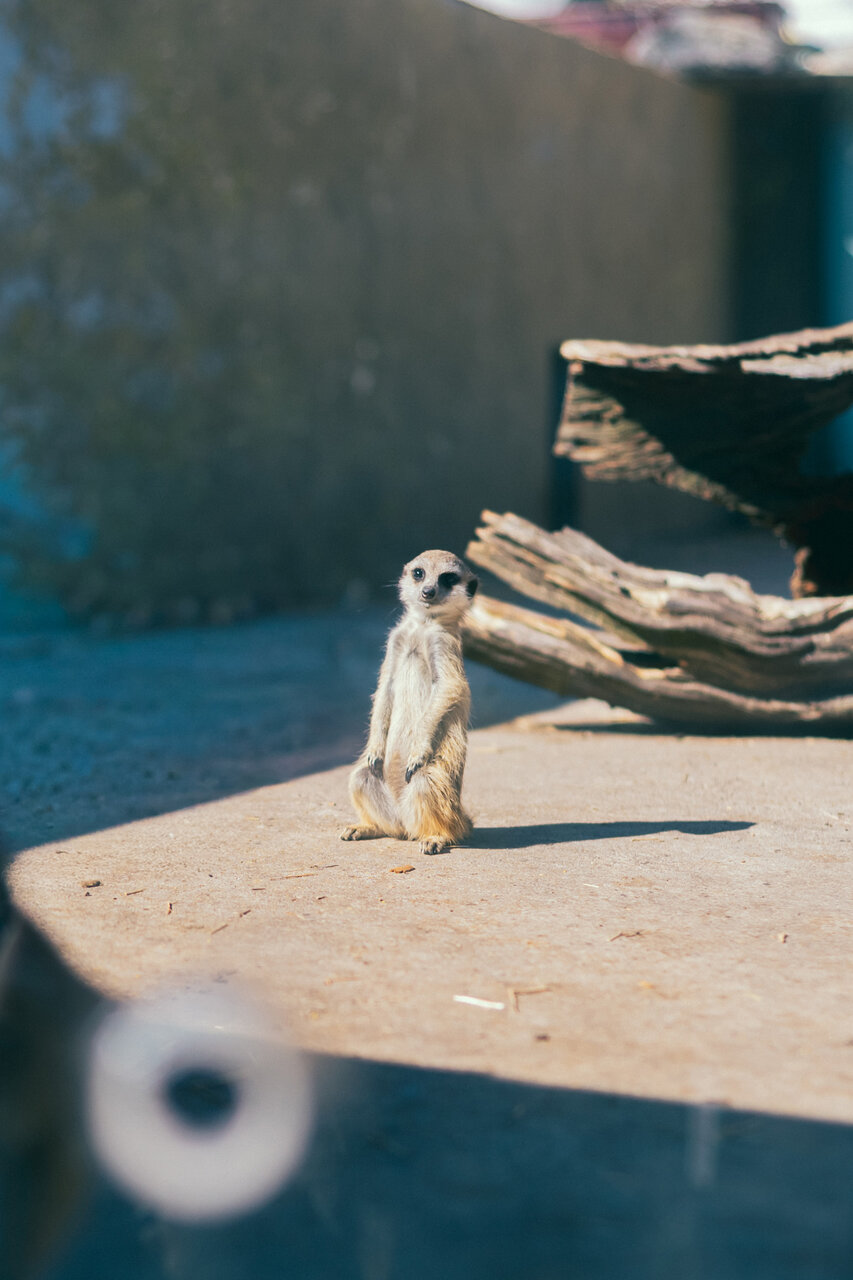 次は「わくわくふれあい広場」へ。小動物との距離が近く、自然の中でさまざまな動物たちが共存している雰囲気を写真でも表現できます。ミーアキャットやヒツジ、ヤギのすみかもあり、ともに至近距離で触れ合えます。