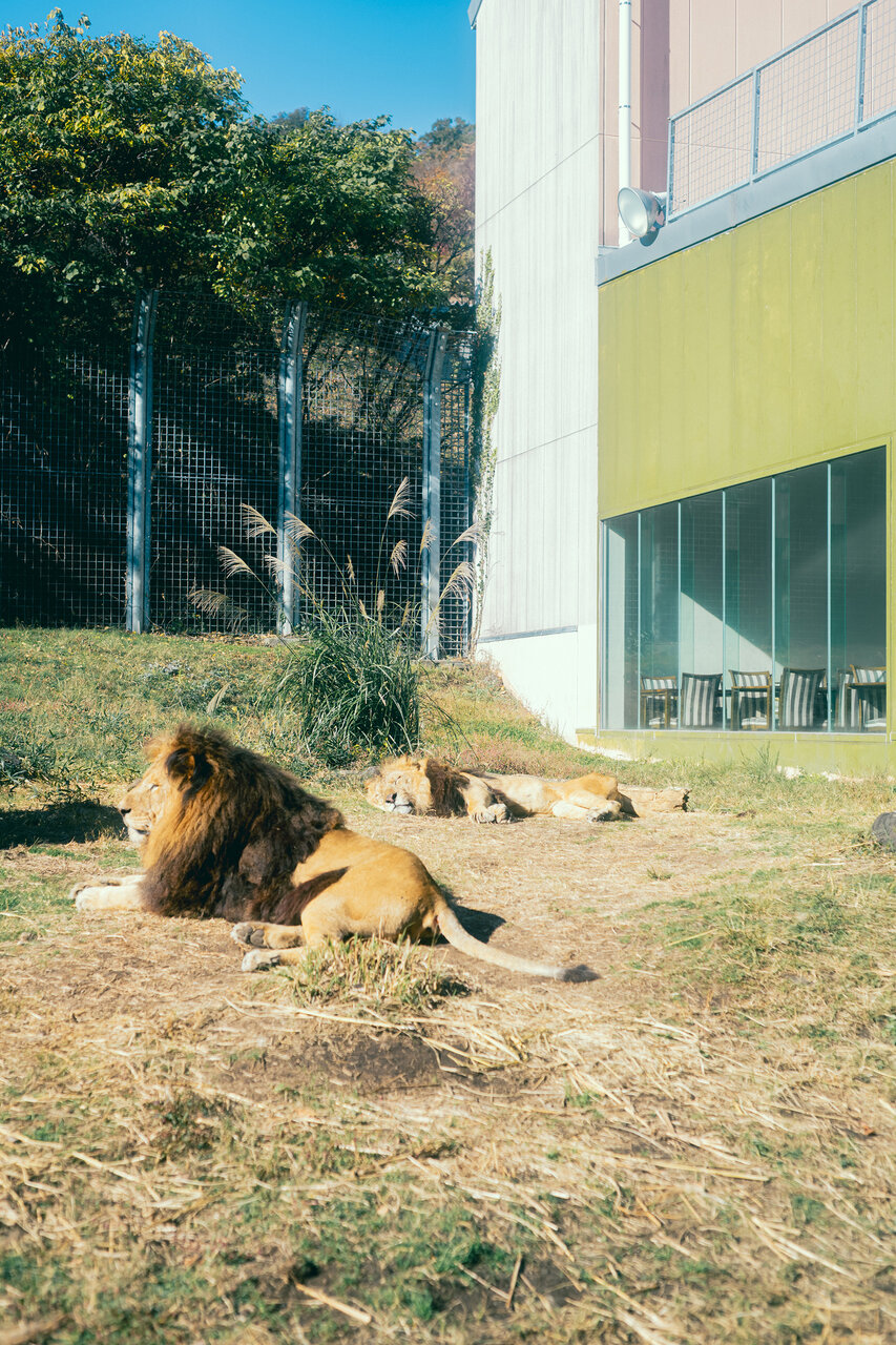 猛獣館では、ホワイトタイガーやライオンなど、動物園ならではの迫力ある動物たちに出会えます。百獣の王と呼ばれるライオンも、園内ではすやすや眠る姿が愛らしく、本当に印象的でした。
