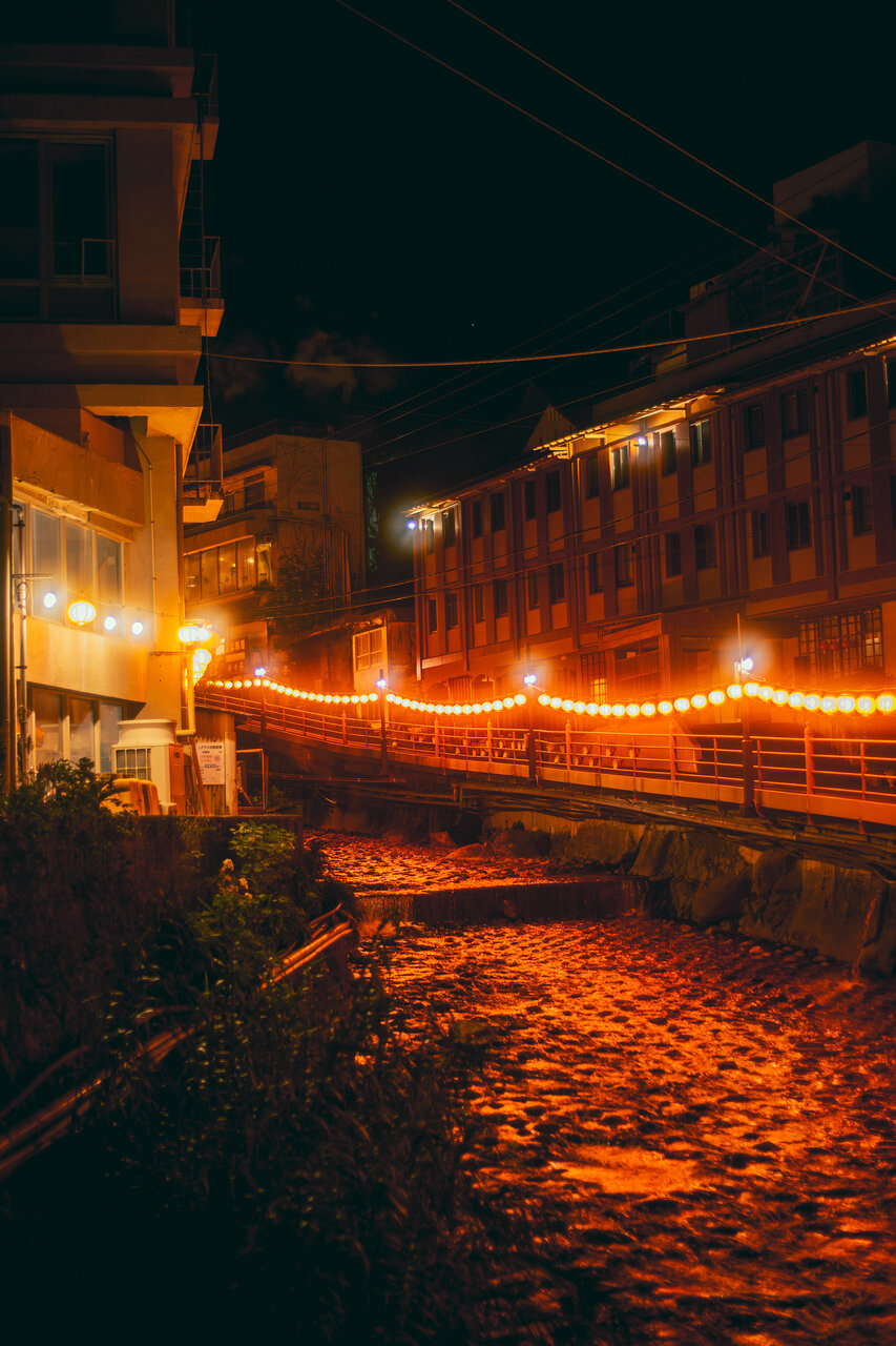 提灯や街灯をアクセントにして奥行きを出す構図や、ガラスや水面、路面に映る灯りを反射としてフレームに入れると、温泉街の夜の旅情をよりドラマチックに切り取ることができます。チャレンジしてみてください!