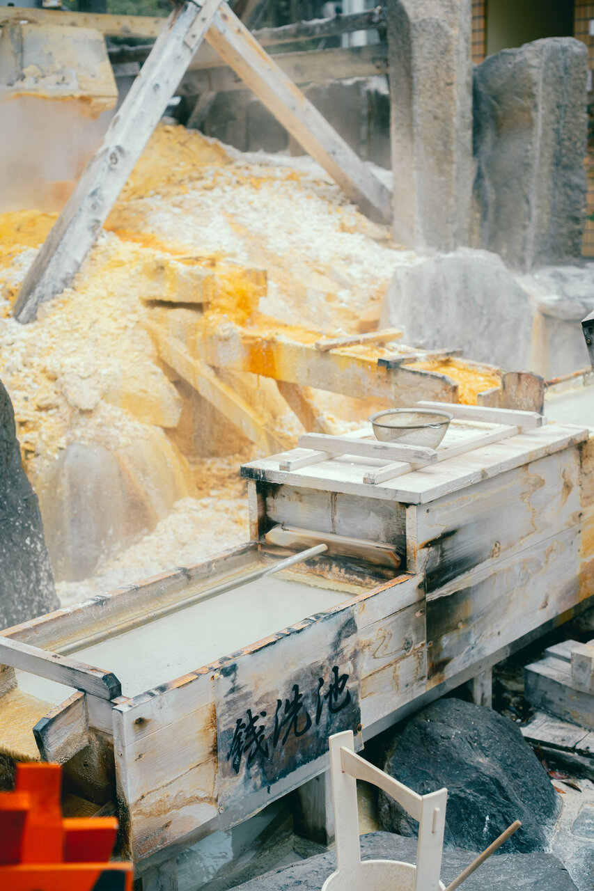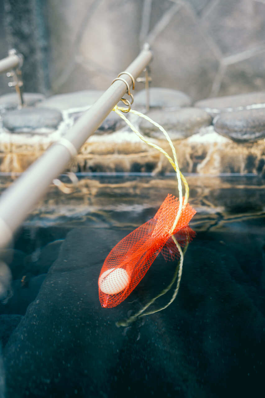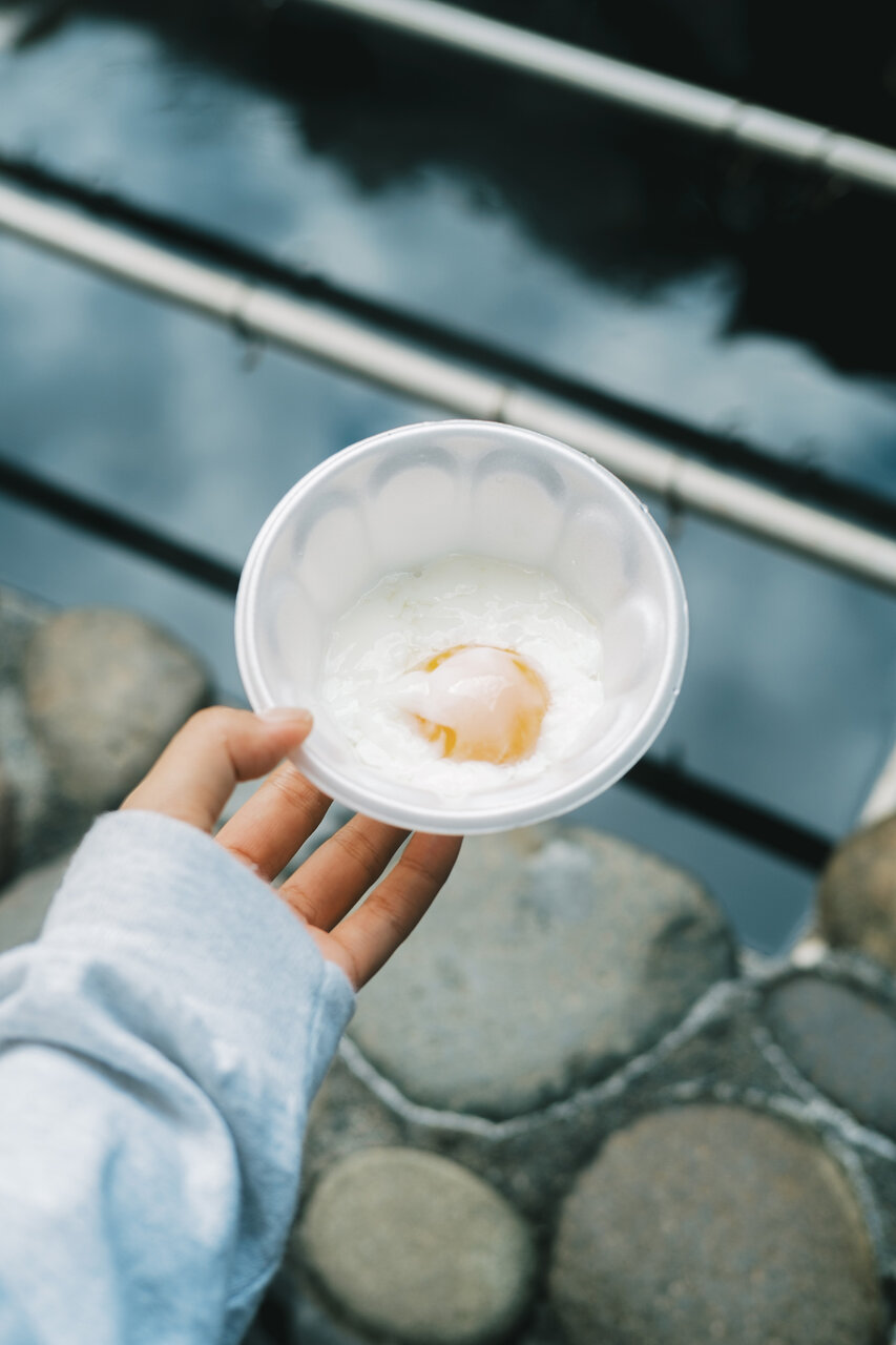 卵がゆで上がるのを待つ間、足湯に足をつけ、湯気や温泉の香りと風を感じながら、街へ向かう人々の足音や駅前の空気を楽しみました。出来上がった源泉ゆで玉子に少し塩をつけて口に運ぶと、源泉の湯気に包まれた空間の体験も加わり、味わいが一層引き立ちました。