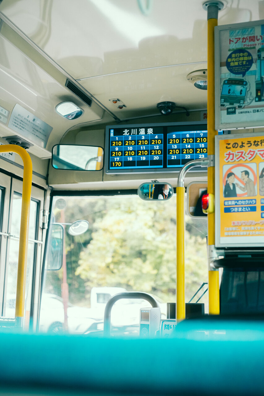 熱川温泉バス停から、東海バス大川公民館行(S01系統)に乗り、「北川温泉(ほっかわおんせん)」へ向かいます。バスに揺られていると、山の景色が少しずつ開けて、視界の先に海の青が広がりはじめました。目的地へ近づいていくワクワクと、旅の終わりが近づく少しの寂しさが混ざり合います。