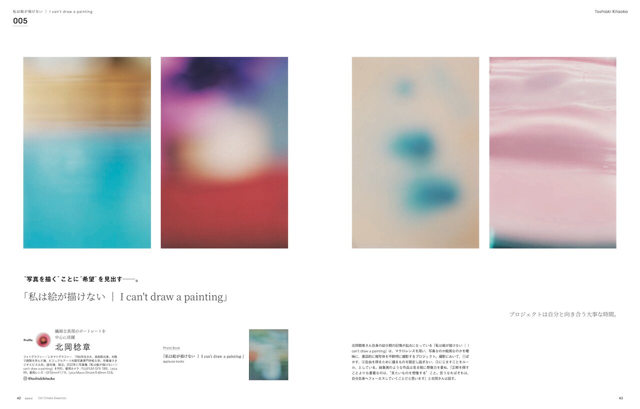 「誰にも頼まれていないのに、シャッターを切り続ける。無駄に思える行為が一番美しく、一番難しい」。「写真は、『沈黙と会話するためのチケット』。誰かの涙、誰かの希望、誰かの孤独が写真の力で、言葉にならないまま浮かび上がる」。など、強く響き渡る言葉が満載の6ページ。オリジナルプロジェクト「Translator」「Trimming」「Time of Light」の写真作品とともに、お楽しみください。