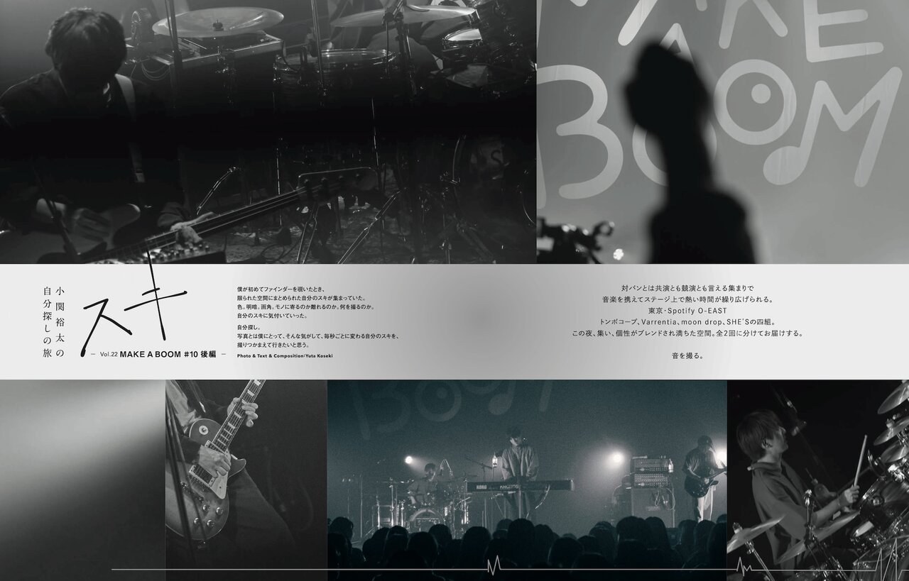 前回に続き、「BOOM BOOM BOOM ch.」が渋谷で行ったイベント「MAKE A BOOM #10」にて、自らカメラを構え撮影した写真を掲載。後編に登場するのは、moon drop、SHE’Sの2組。小関裕太自身による構成、デザインもお楽しみください。連載第22回。