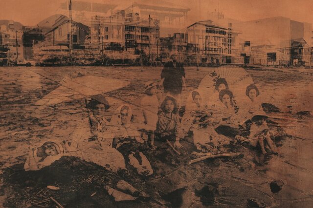 「この作品はフィルム撮影だと思われることも多いのですが、100年前の絵葉書をベースに使っていて、それに写っている場所で同じように写真を撮って重ねたものです。僕がやっていることはまず場所を探す作業から始まり、見つけたら、そこで絵葉書と同じ角度から写真を撮る。それをフォトショップ上で重ねる。その後に白黒のインクジェットプリントで白い紙にプリントする。そのプリントを『温泉染』するというものです。今回の作品はオレンジっぽく仕上がっていますが、この場所とゆかりのある別府の温泉水を使っています。温泉というのは基本10種類あり、細かく言えば同じ泉質はないので、成分が違うもので染めれば、色ががらりと変わるのが『温泉染』の面白いところです」。