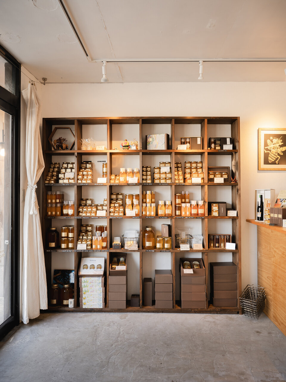 2022年オープンのはちみつ専門店「養紡屋(ようほうや)」。種類豊富なはちみつがズラリ。