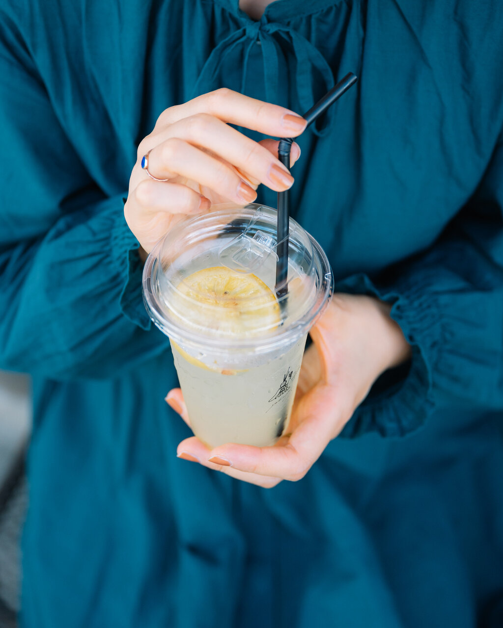 お店の外でいただく「はちみつレモネード」。はちみつの風味をしっかり感じられるのに、後味はスッキリ。