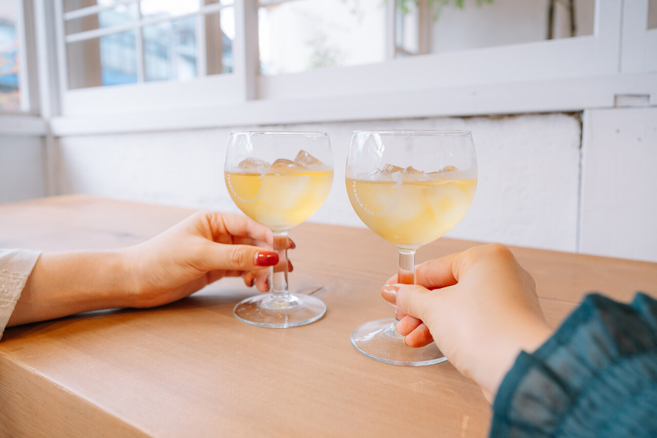 店主のご厚意で、浜松市春野で栽培されたお茶をいただく。ワイングラスで乾杯。雑味のないクリアで爽やかな風味が心地よくて、持って帰って毎日飲みたくなっちゃう。