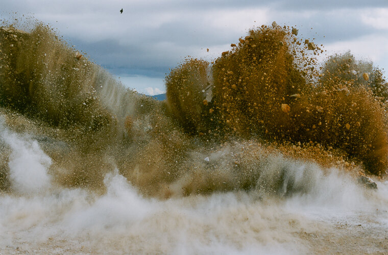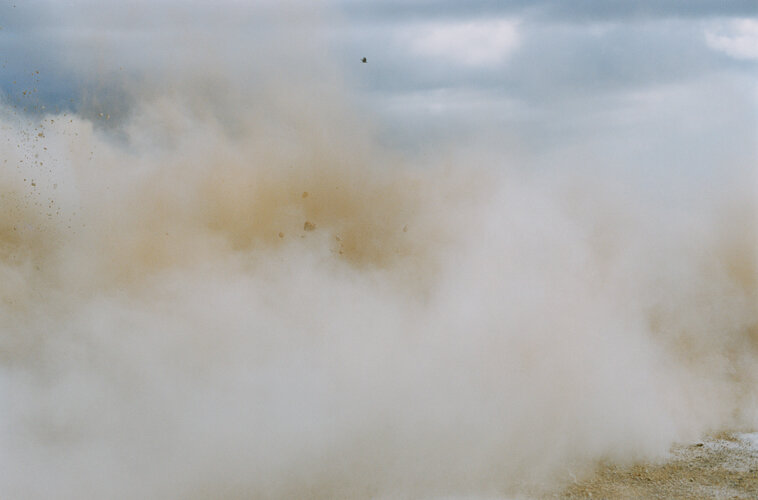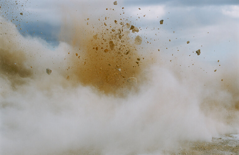 2006年に Taka Ishii Gallery より1000部限定で刊行され、長らく絶版となっていた「A BIRD BLAST #130」が、このたびroshin booksから復刊されます。 畠山直哉の代表作として知られる「BLAST」シリーズは、長年にわたり採石場の発破の瞬間を遠隔操作で撮影した作品群です。人が立ち入ることのできない危険地帯にカメラを設置し、爆発の刹那を記録するという独自の手法は、世界的に高い評価を得てきました。その制作過程のあるとき、畠山氏は撮影後のコンタクトプリントに、意図せず写り込んだ一羽の鳥を発見します。 この出来事について、氏は著書の中で次のように述べています。