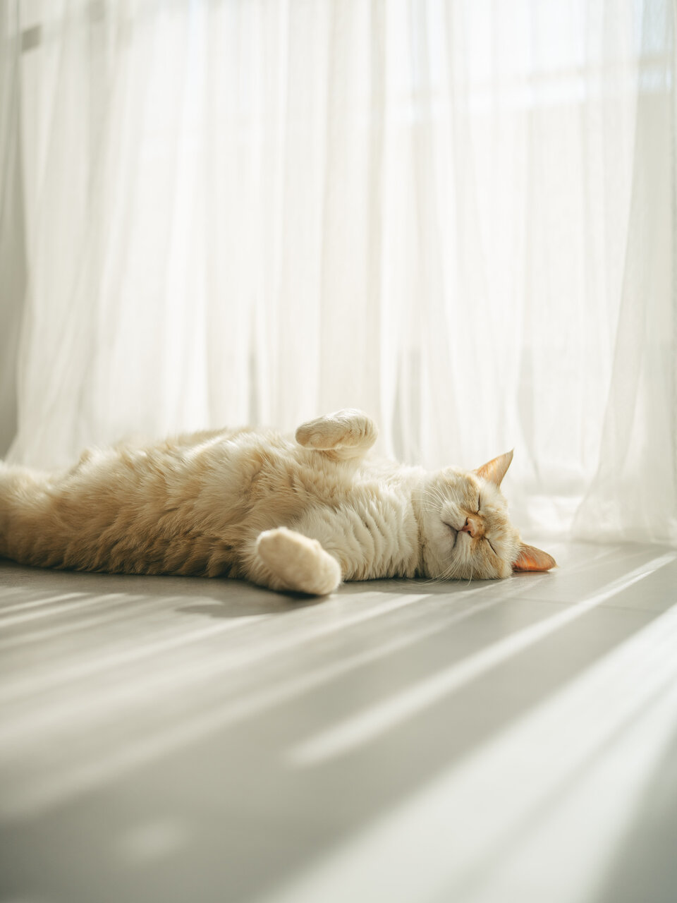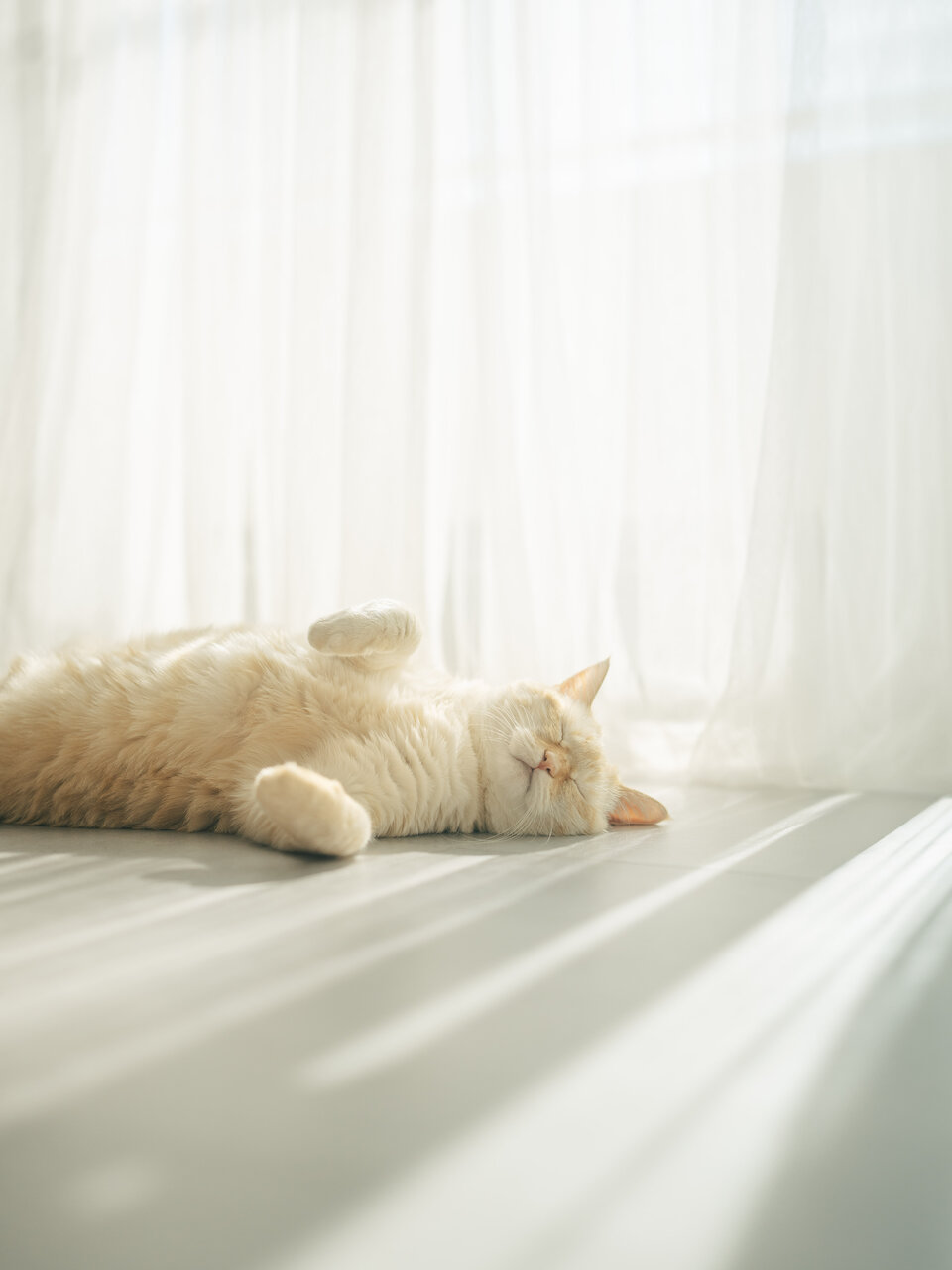 レースカーテン越しの光が床に優しく落ちてくる時間帯に、猫が気持ちよさそうに寝転がっている姿。太陽が高く昇りきる前の、光がまだ柔らかい黄金の朝時間で、猫の白い毛並みと、床に伸びる影のコントラストが美しく感じられました。ホワイトミスト No.05の優しい効果が引き立つよう、光が背景から面で入る位置にカメラを構えました。レースカーテンのハイライトが程よく滲むことで、猫の表情がより穏やかに見えることを想定して、少し低いアングルから撮っています。また、露出は飛ばしすぎないように抑え、光の柔らかさだけを足すという撮り方を意識。光が優しく揺れて見えるような仕上がりになり、お気に入りの1枚に。被写体の輪郭や立体感はしっかり残しながら、光だけがふわっと広がるホワイトミスト No.05の魅力を改めて感じます。