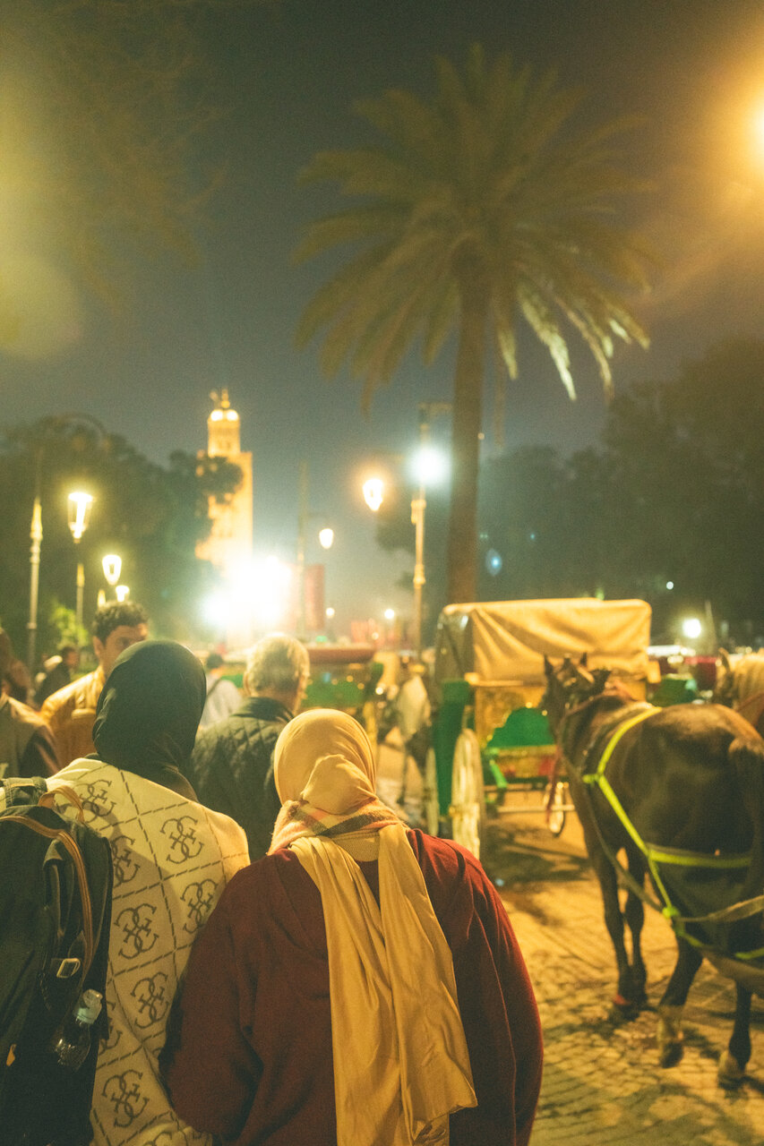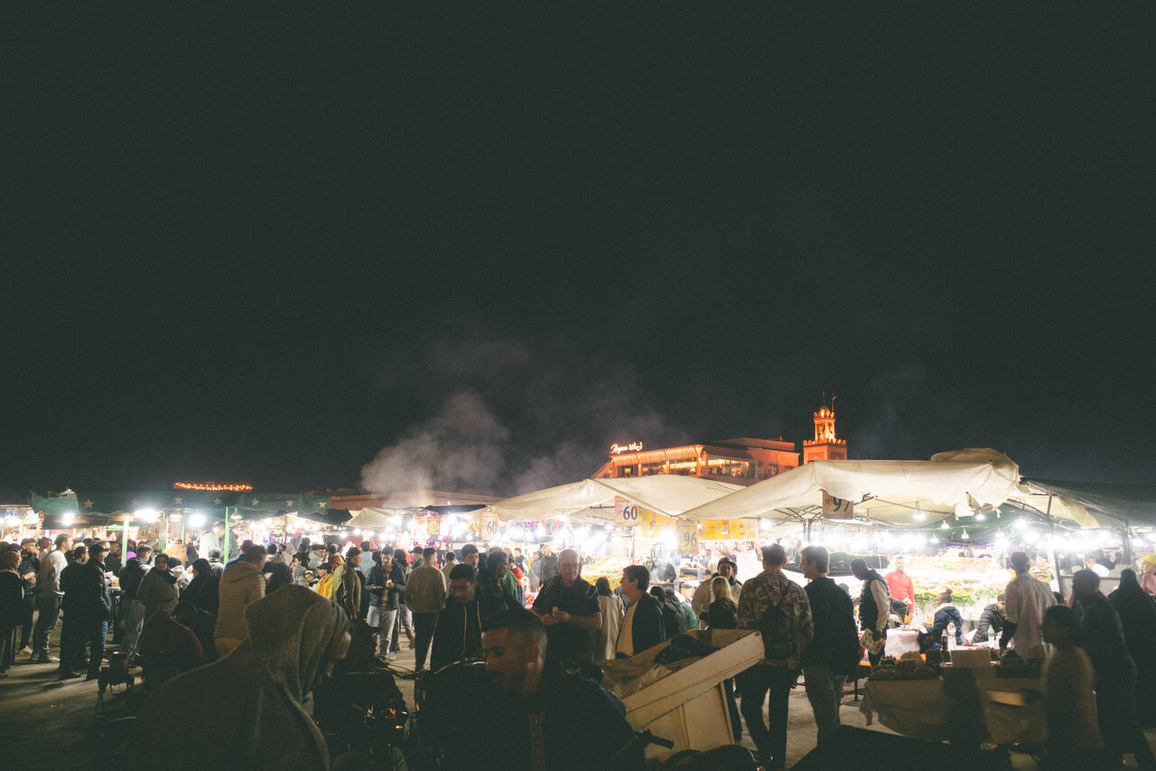日が傾く頃にはジャマ・エル・フナ広場(Place Jemaa el-Fnaa)が一層賑わいを増し、屋台から立ちのぼる煙や大道芸人のパフォーマンスが広場全体を包み込みます。昼と夜で表情を変えるこの広場は、マラケシュの活気を象徴する舞台です。
