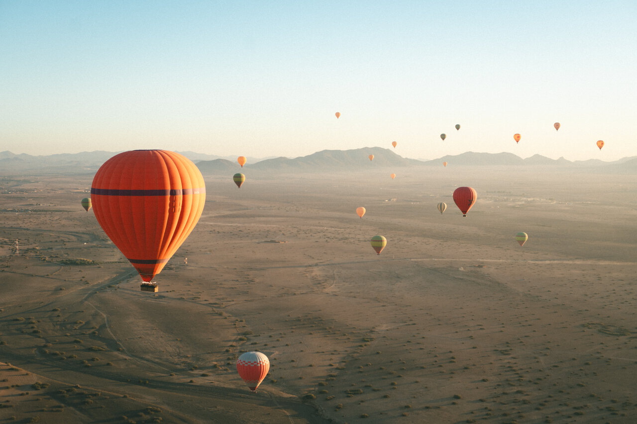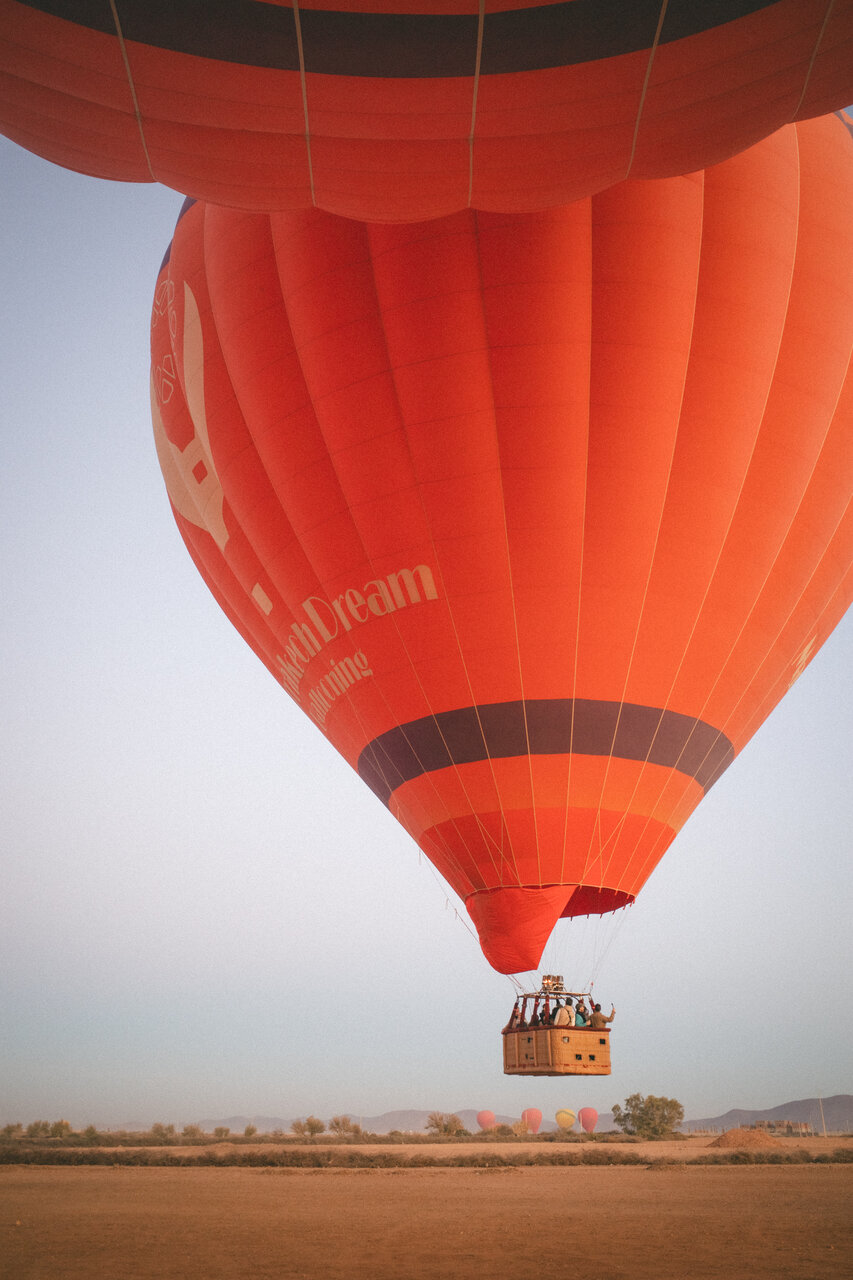 早朝、熱気球に乗り込みマラケシュ郊外の大地を空から見渡します。夜明けの光が広がり、街並みは赤い色合いを帯び、遠くにはアトラス山脈が姿を現します。上空からの視点では、屋根や路地が幾何学的な模様のように広がり、都市の構造とともに朝日の美しさを一望できます。