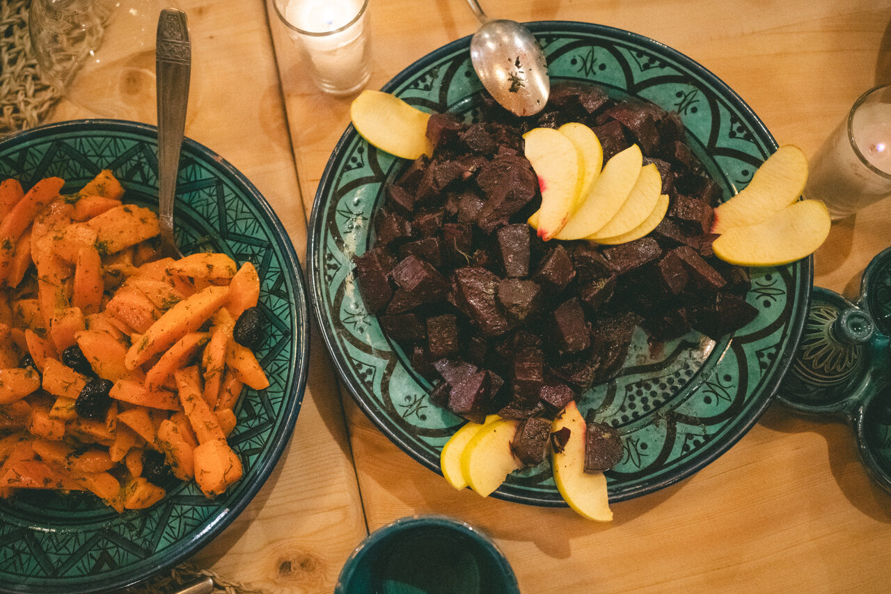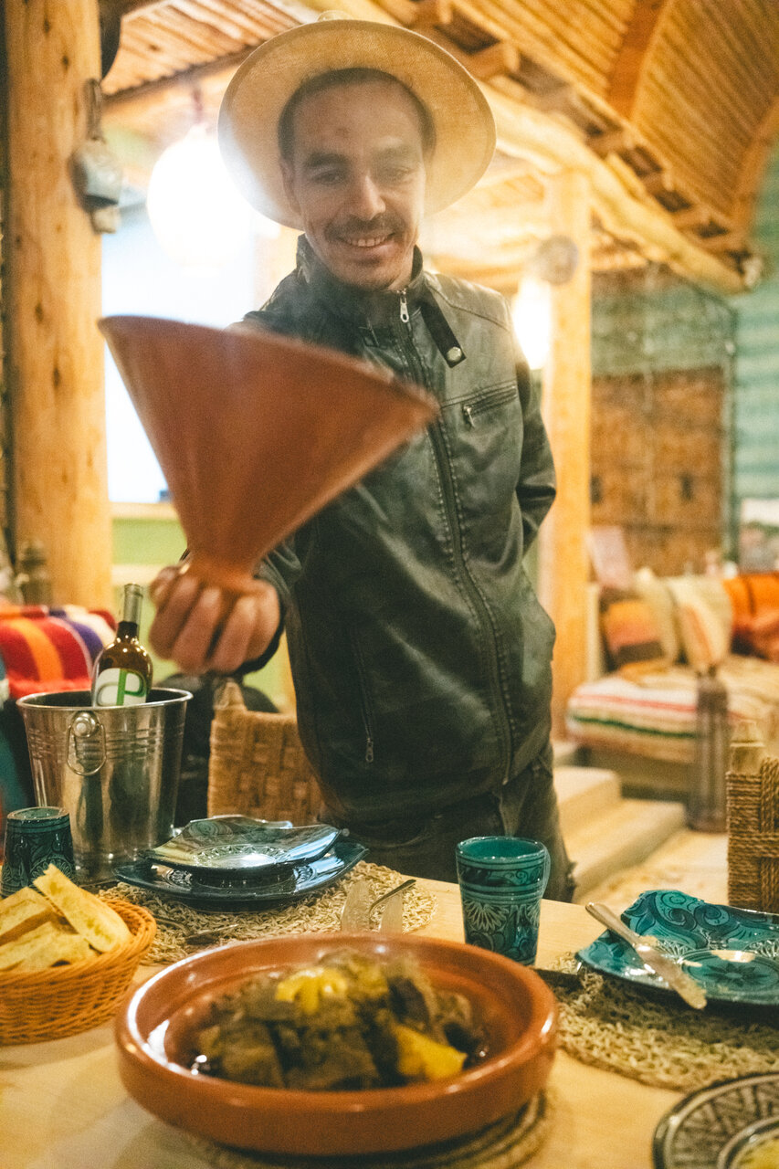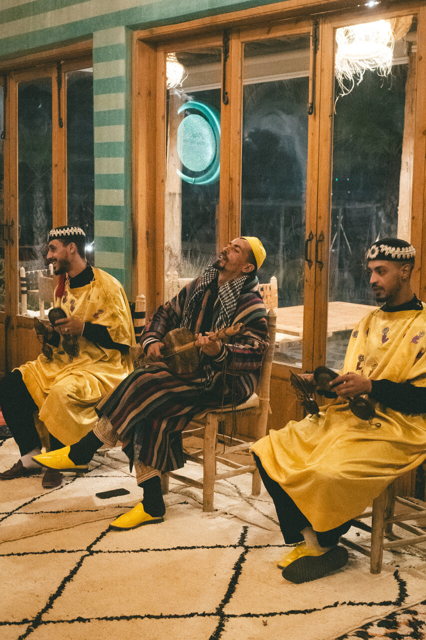伝統的なモロッコの青いお皿がとてもかわいく、料理がより美味しく感じられました。生演奏を聴きながらいただいたタジンは素朴でやさしい味わい。砂漠の静けさの中でゆっくり過ごす、心地よいディナーでした。