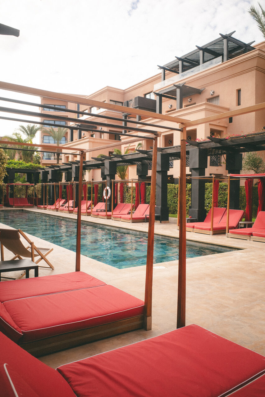 街全体がマラケシュカラーで統一されていて、その独特の色合いに心が躍りました。ホテルの中も同じトーンでまとめられていて、このプールとは別に大きなプールもあり、木々がつくる開放感がとても心地よかったです。庭でのんびり過ごす人も多く、ゆっくりとした時間が流れる空間でした。