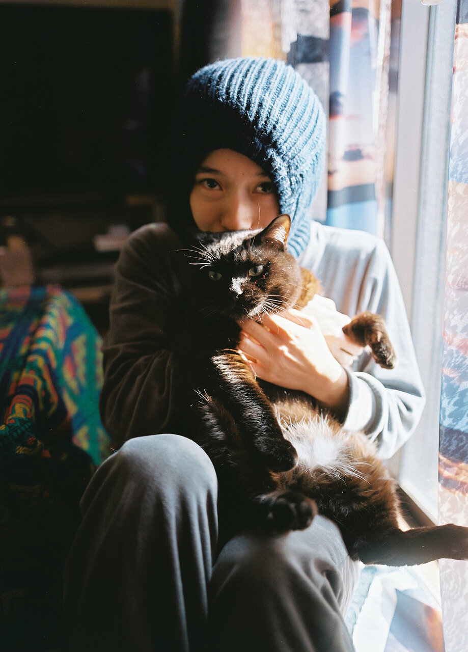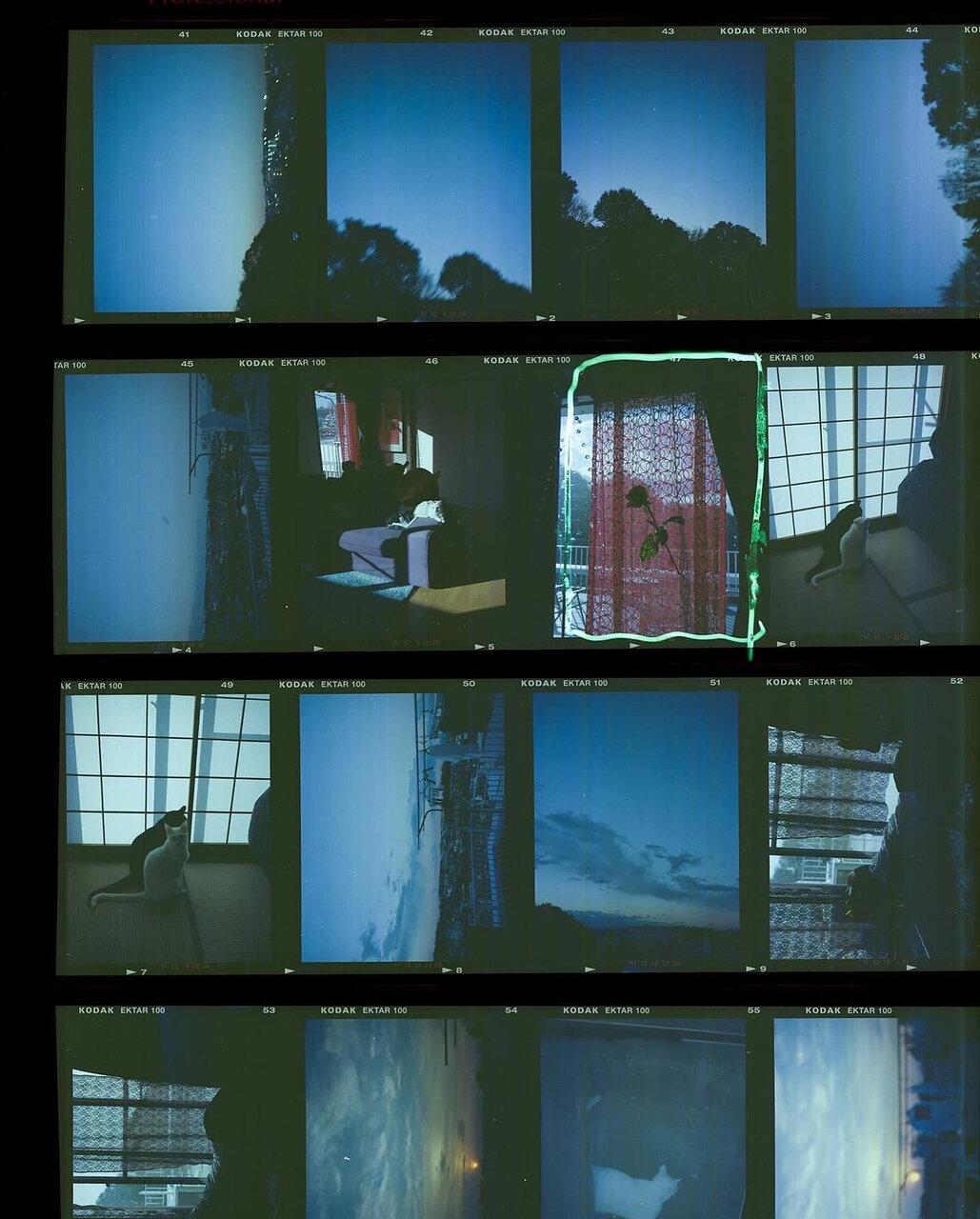 「当たり前を見直す、ということを大切にしています。猫が元気でいてくれるとか、読んだ本の言葉に考えさせられるとか、夕焼けの美しさとか…そういうことを享受できるのは当たり前じゃないということを忘れないで暮らしたい。こんな風に考えるようになったのは、30代になり写真を始めて、猫と暮らし始めてからでしょうか。朝起きたらコーヒーを飲み、バルコニーからの空を見て撮影します。撮影の仕事がなければ大体部屋で本を読んだり、猫と遊んだり、気が向けば室内やバルコニーで撮影します。陽が傾きだすと、夕方の散歩をします。展示や制作がある時以外は、とにかくのんびりしています。そして、その時の何かを残したいなと思う時に、シャッターを切ります。撮ることは残すことだから、いつか無くなる物事への防衛本能みたいな行為なのかもしれません。特に撮りたくなるのは、猫が可愛い時(大切だから。それなのに、いつかいなくなっちゃうのを知っているから)、パートナーがふざけている時(意味がわからなくて面白いから)、そしてなんでもない時間(後で思い出すのは大体そういう時が多いから)。写真を撮っておけば、明日でも10年後でも見返すことができます。もう会えない人や物事でも、写真の中では見ることができます。写真だけではやっぱり喪失感や寂しさは埋まらないとしても。僕にとって、写真は時間の記録、そして執着と惰性です」。