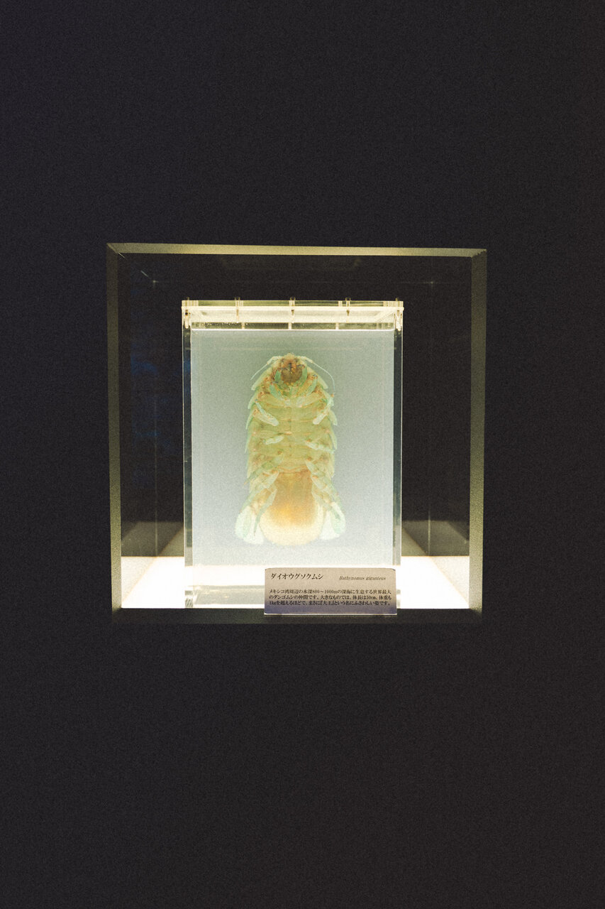 ダイオウグソクムシの透明骨格標本は、芸術作品のように美しかったです。沼津港深海水族館で亡くなってしまった深海生物を、飼育員さんが透明骨格標本にして展示しているようです。飼育員さんの愛を感じました。