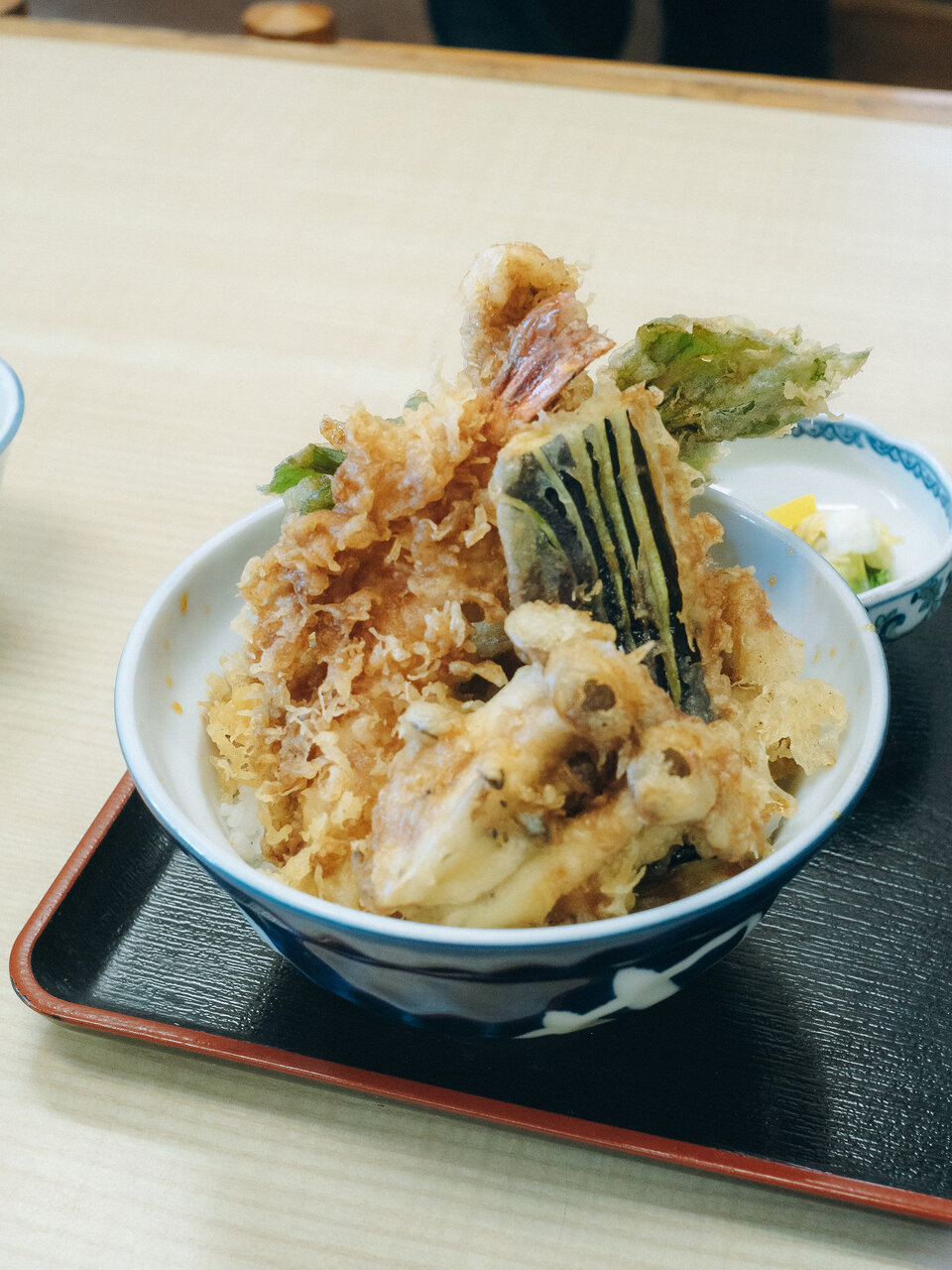 注文したのは、その日に仕入れた旬の食材で作られた天丼です。テレビを見ながら、まったりしていると注文した天丼が運ばれてきました。この日はアシタバ、なす、太刀魚、紫いか、しめじ、そしてぷりぷりのエビ。衣に包まれた食材がとても美味しくて、あっという間に完食してしまいました。特にこの日は「アシタバがたくさん手に入ったから乗せたんだ」とお店の方が教えてくれました。
