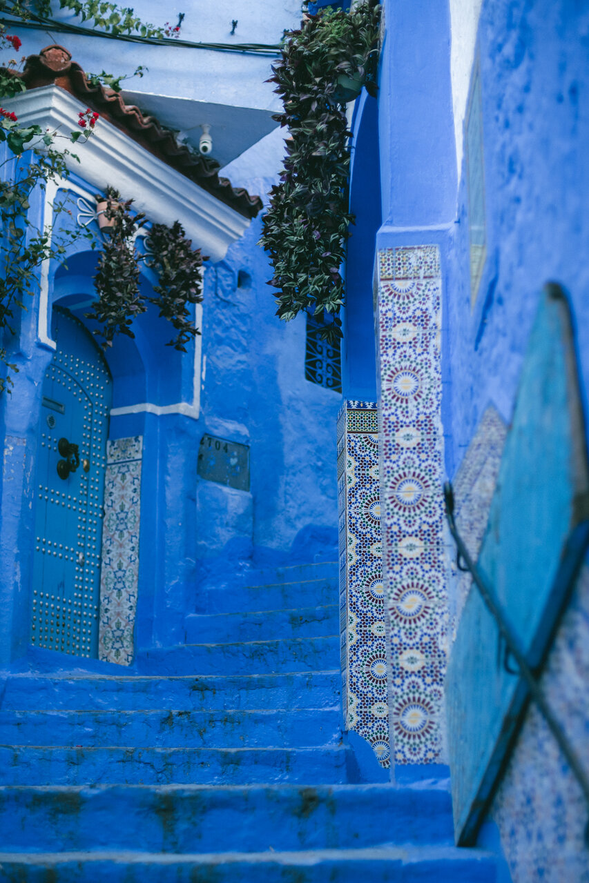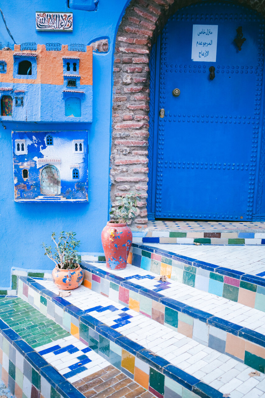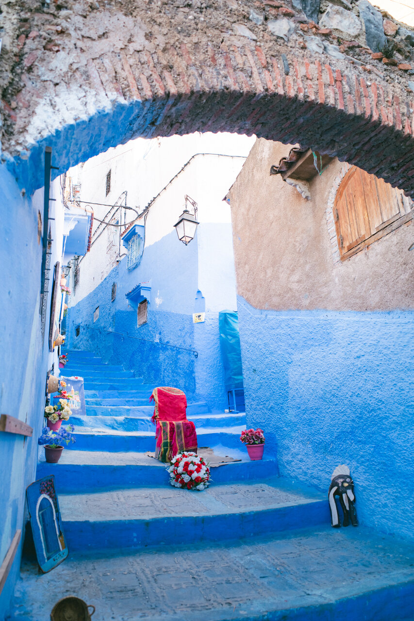 遠くから眺めたシャウエンの街並みも美しかったけれど、街中に入ると一面に広がる鮮やかな青、細い路地、そして高低差が重なり合う階段、まるで物語の世界に迷い込んだような感覚になりました。