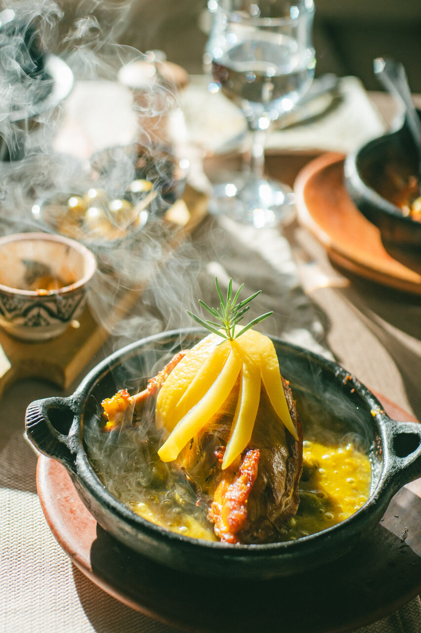 リアドでの滞在では、食事も大きな楽しみの一つ。代表的な料理のひとつがタジンで、水を加えず、食材の旨みをじっくり閉じ込めて煮込むスタイル。肉や野菜の風味を存分に楽しめます。リアドの中庭を眺めながら味わう食事は、旅の時間をさらに特別なものに。