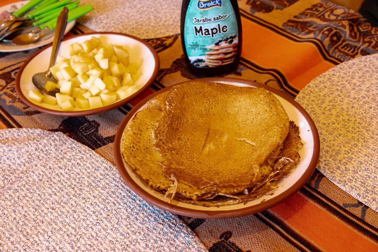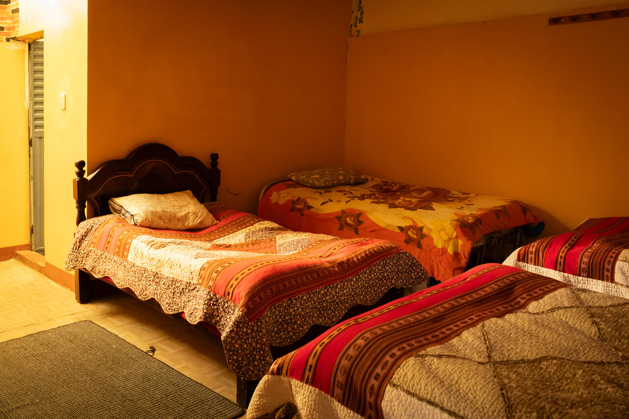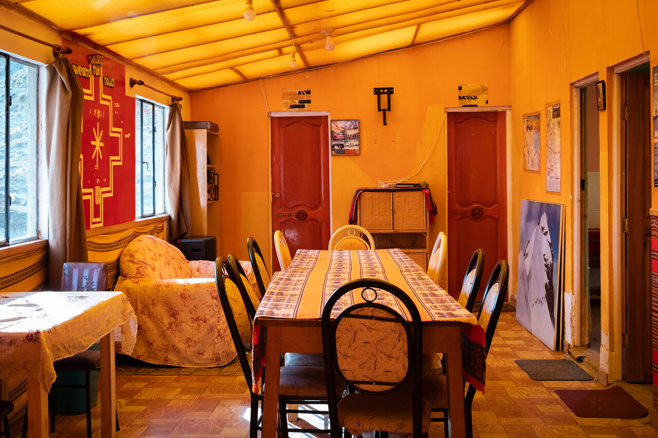 歩き疲れた足をお茶で温めながら、織物の色や模様がどんな意味を持つかを教わる。窓の外ではアルパカがのんびり草を食べ、遠くでは雪山が沈む夕日でピンク色に染まる。トレッキングの途中で、こんなにも「暮らし」に触れられるのは、この旅ならでは。