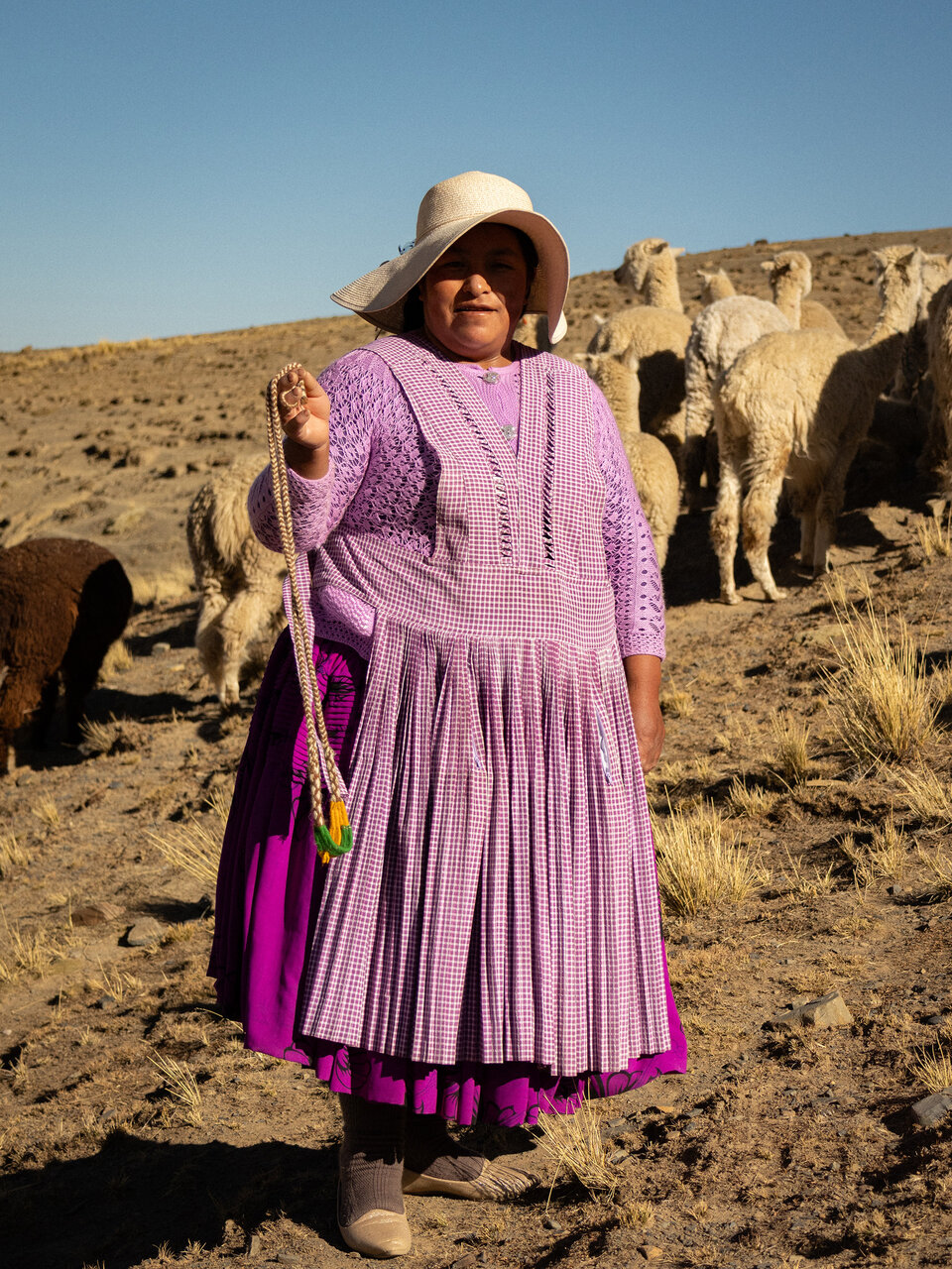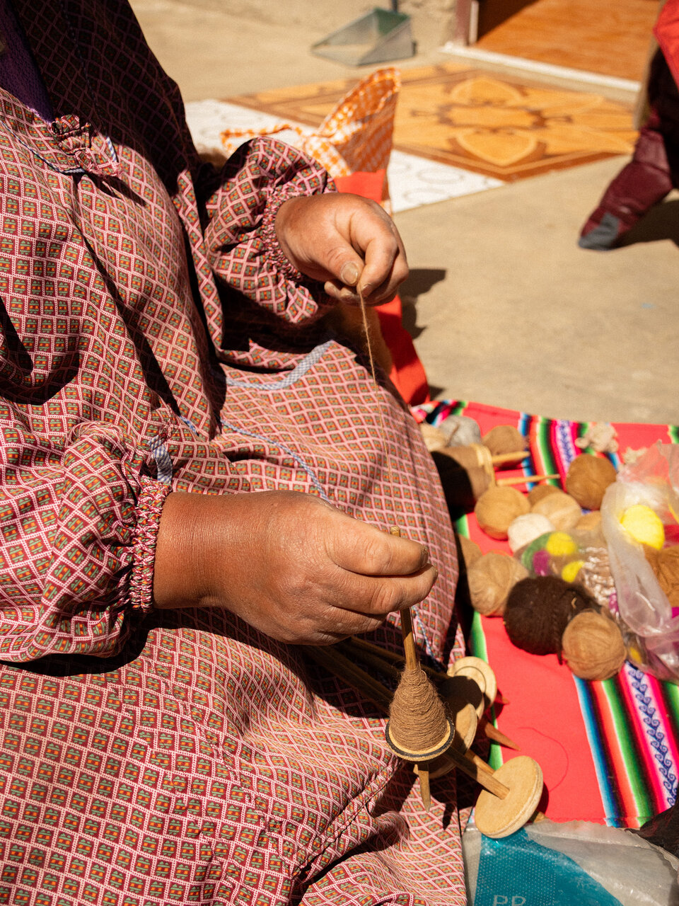 村に到着すると迎えてくれたのは、アンデスの空のように明るい笑顔のマリソル。彼女の家族は代々アルパカを育て、その毛を紡ぎ、糸や織物を作ってきた。私たちは手洗いしたばかりのふわふわのアルパカ毛を手に取り、マリソルに糸の紡ぎ方を一から教わる。くるくるとスピンドルを回しながら、重さやテンションを微調整していく作業は、見た目よりずっと繊細。標高4,500mの澄んだ空気の中で、ゆっくりと糸が細く長くのびていく。指先に“強さ”と“しなやかさ”を感じるアイマラの技は、ただの手仕事ではなく、厳しい自然とともに生きる知恵そのものだった。