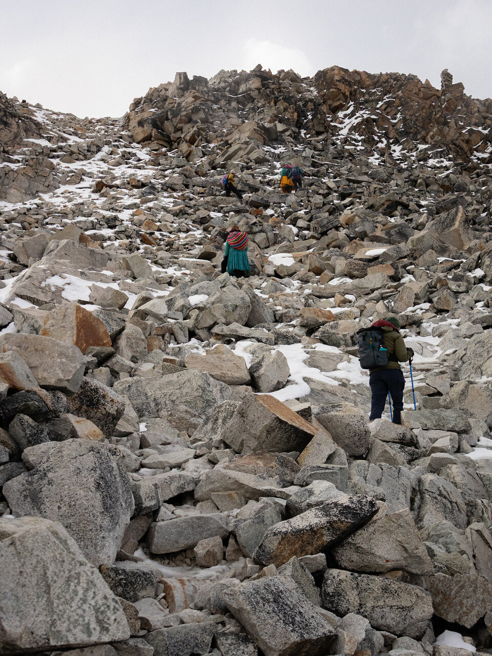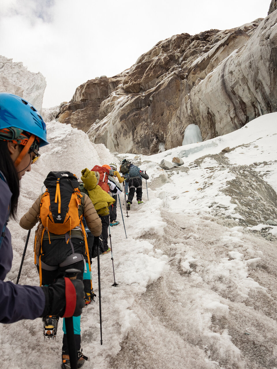 標高は5,200mへ。標高が上がるにつれ、あたり一面が白い世界へと変わっていく。風は鋭く、息はすぐに上がる。それでも、目の前で氷壁に向かうチョリータたちの背中が、私たちの足を自然と前へ進ませた。