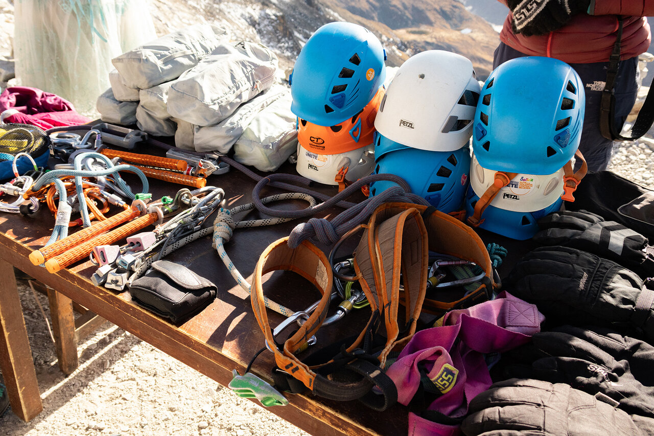 AgustinとLitaが、氷河の状態を確認しながらロープを張る。長年、山と生きてきた彼の判断は的確で、動きに迷いがない。その横で、Estrella が私たちのアイスアックスとクランポンをチェックしてくれる。