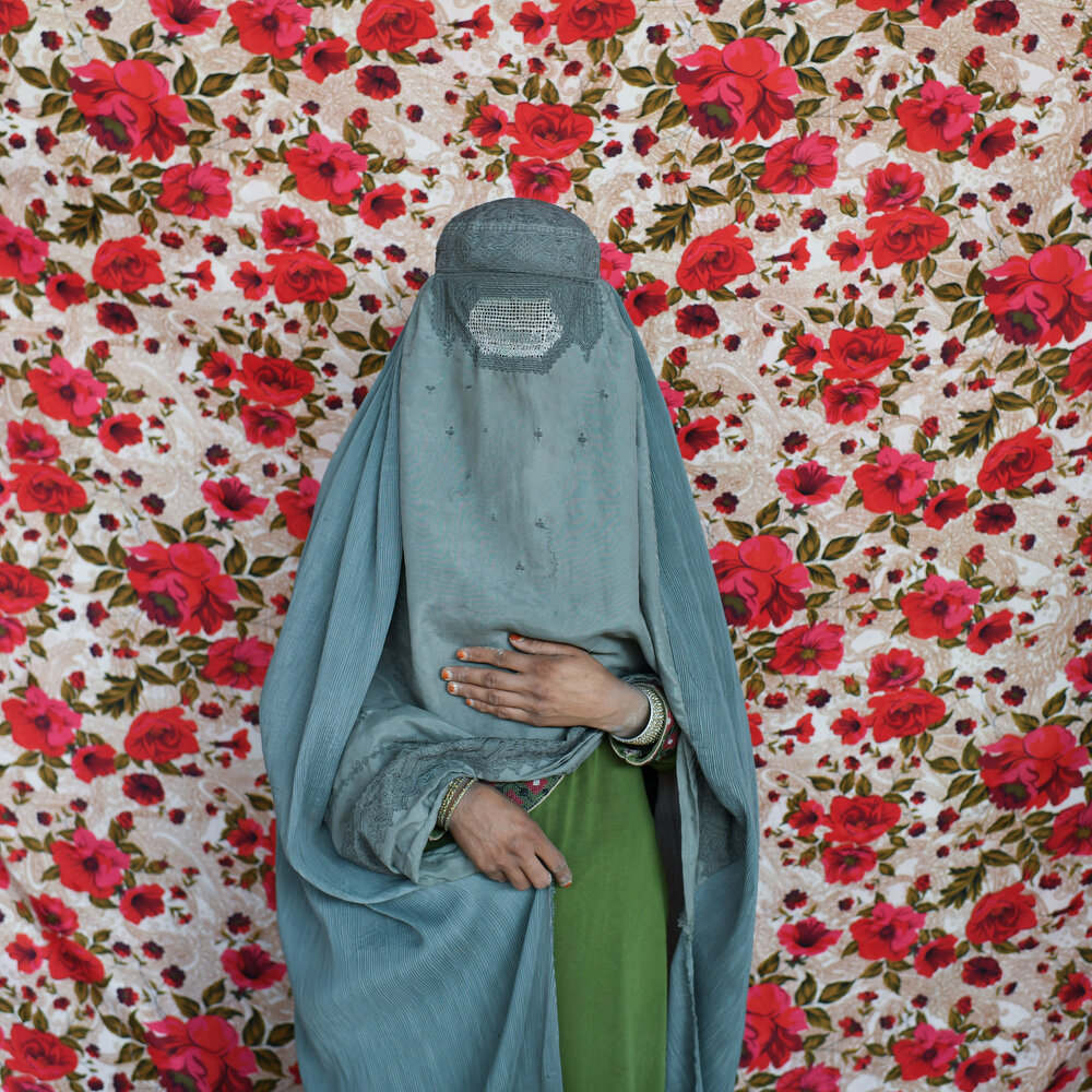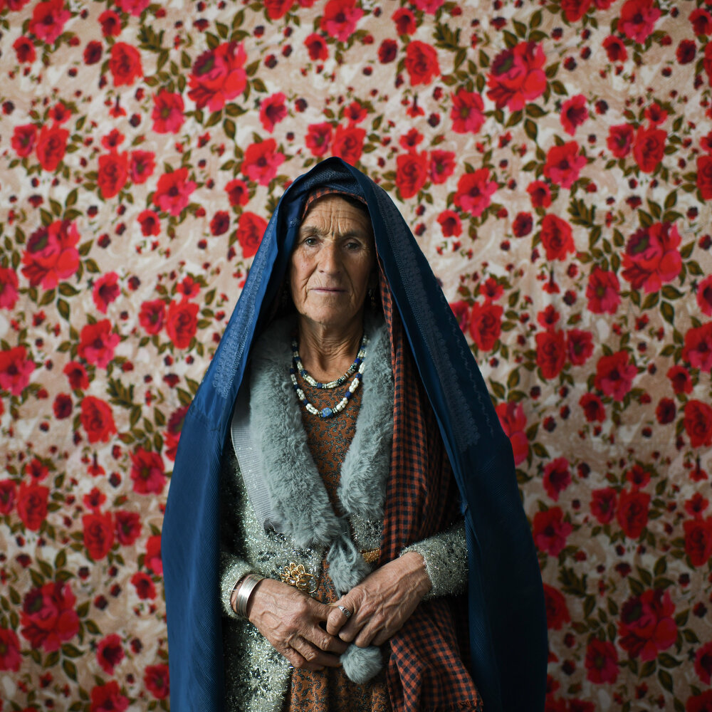 それでも、外の世界でベールに包まれた女性たちの姿とは対照的に、彼女たちが暮らす部屋に足を踏み入れると、壁やクッション、窓辺にまでもが花模様で彩られ、鮮やかな色が広がっていた。2023年、私は北東部バダフシャン州の田舎の村で出会った、ある女性がかつてベッドシーツとして使っていた花柄の布を手にアフガニスタン各地を巡り、女性たちの言葉を記録し、その布を背景に一人一人の肖像を撮影した。